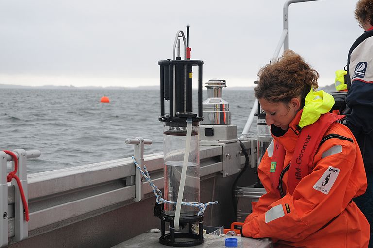 Probennahme im Mesokosmos. Foto: Maike Nicolai, GEOMAR