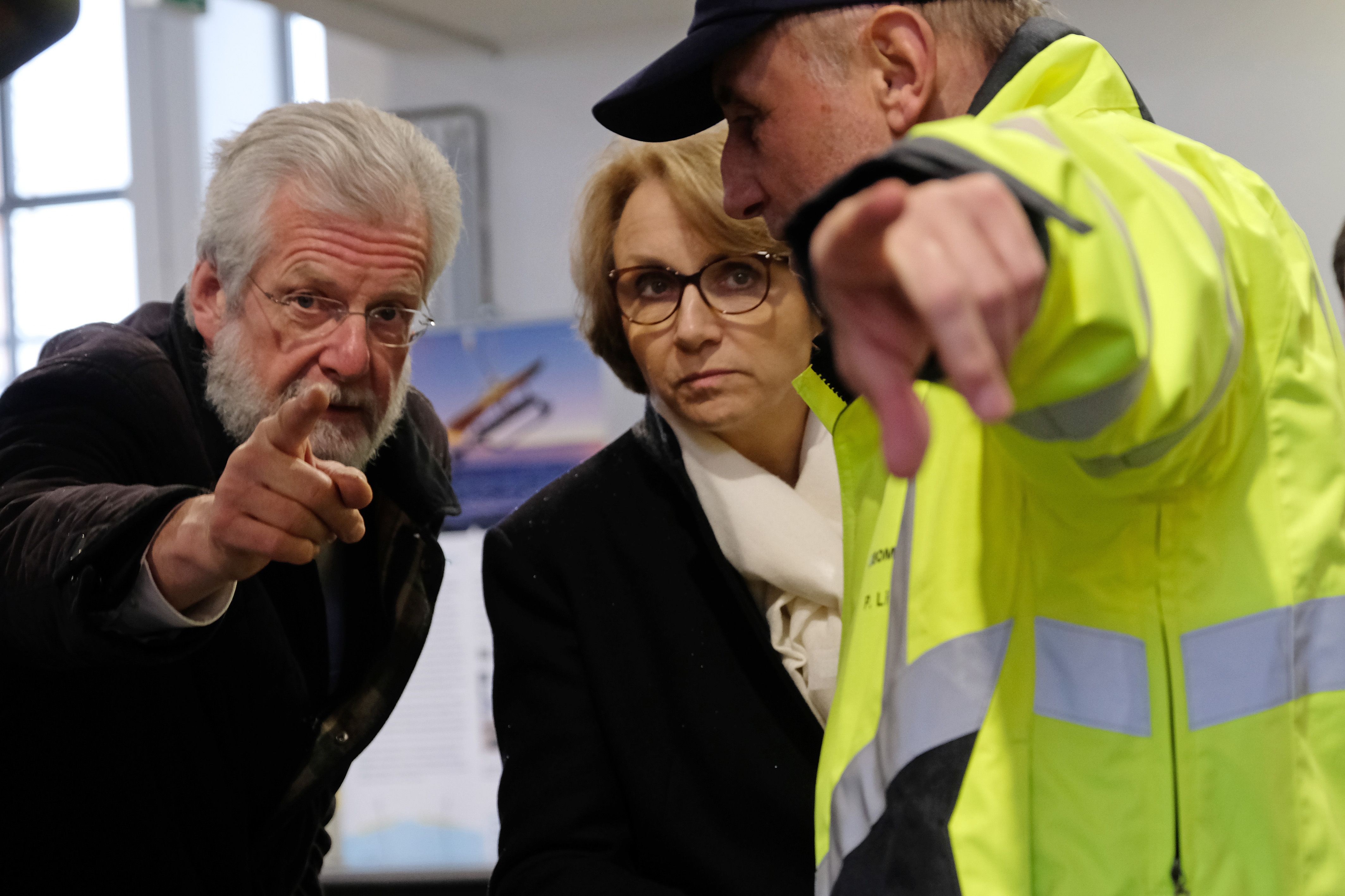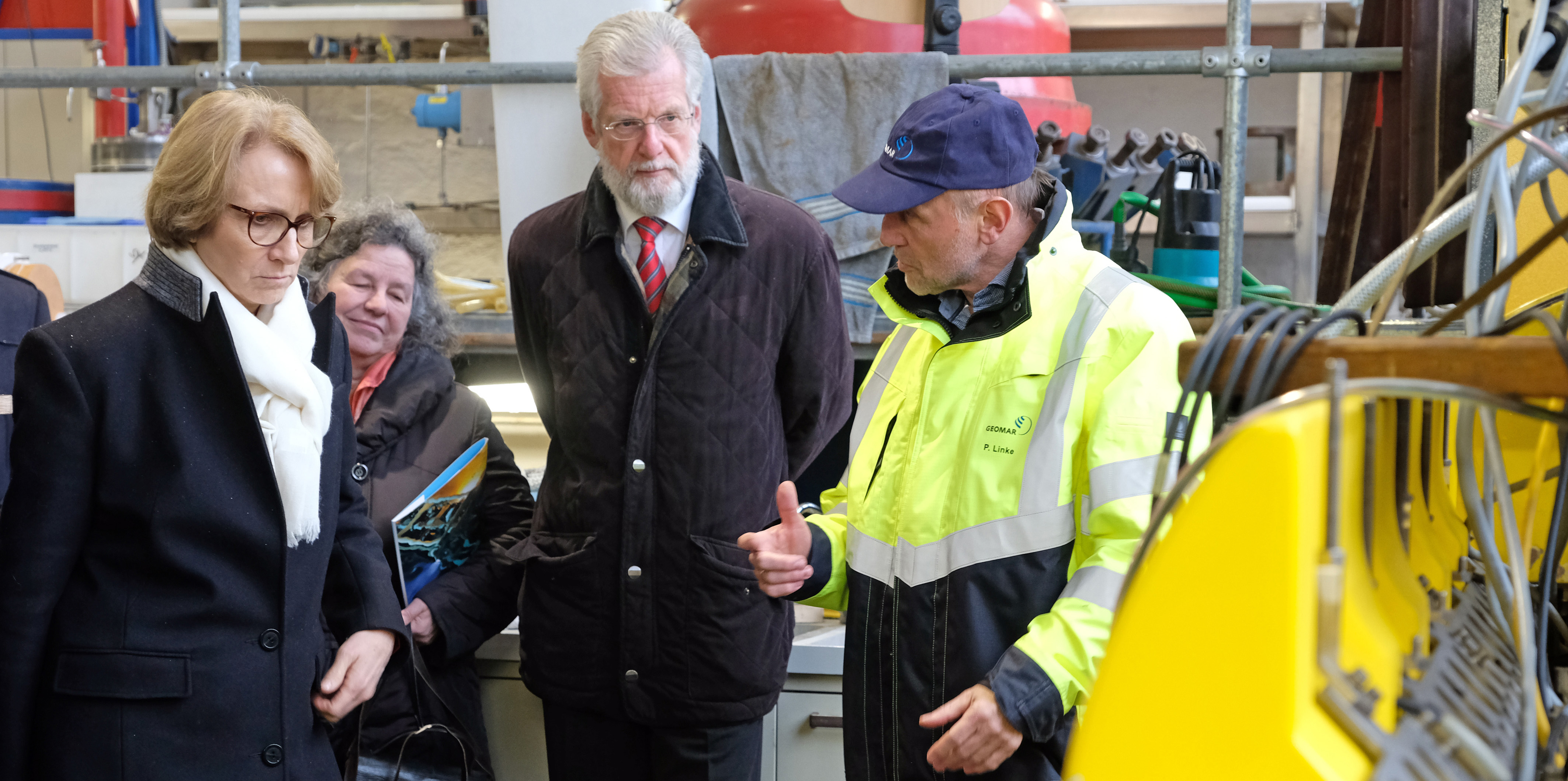 GEOMAR-Direktor Prof. Dr. Peter Herzig (Mitte) und der Leiter des Technik- und Logistikzentrums am GEOMAR, Dr. Peter Linke (re.), zeigen der französischen Botschafterin Anne-Marie Descôtes aktuelle Meerestechnik. Foto: Jan Steffen/GEOMAR.