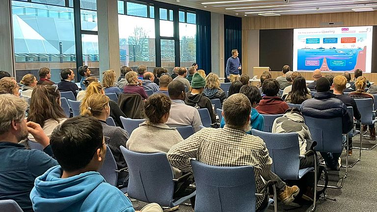 In Kiel gibt es eine Vielzahl von Vertreter:innen all dieser Disziplinen, die das Thema auf Spitzenniveau erforschen. Um diese Expertise zu bündeln, hatte Dr. Florian Schütte, Professor für Physikalische Ozeanographie im Forschungsbereich Ozeanzirkulation und Klimadynamik am GEOMAR Helmholtz-Zentrum für Ozeanforschung Kiel, erstmals Forschende verschiedener Kieler Institute zu einem Symposium eingeladen. Alle vier Forschungsbereiche des GEOMAR, wo der „Auftrieb im Atlantischen Ozean“ im Rahmen der Strategie GEOMAR 2030 einen wichtigen Forschungsschwerpunkt darstellt, waren vertreten, ebenso die Arbeitsgruppen Marine Klimaforschung, Marine Geophysik, Data Science und Politische Ökonomie der Christian-Albrechts-Universität zu Kiel (CAU), das schleswig-holsteinische Landesamt für Umwelt sowie eine Vertreterin des Spanischen Ozeanographischen Instituts (Instituto Español de Oceanografía, IEO-CSIC). Das Treffen fand zudem im Kontext von FUTURO statt, einem geplanten internationalen Projekt mit einjährigem Großexperiment von Westafrika, das vom GEOMAR initiiert und koordiniert wird.