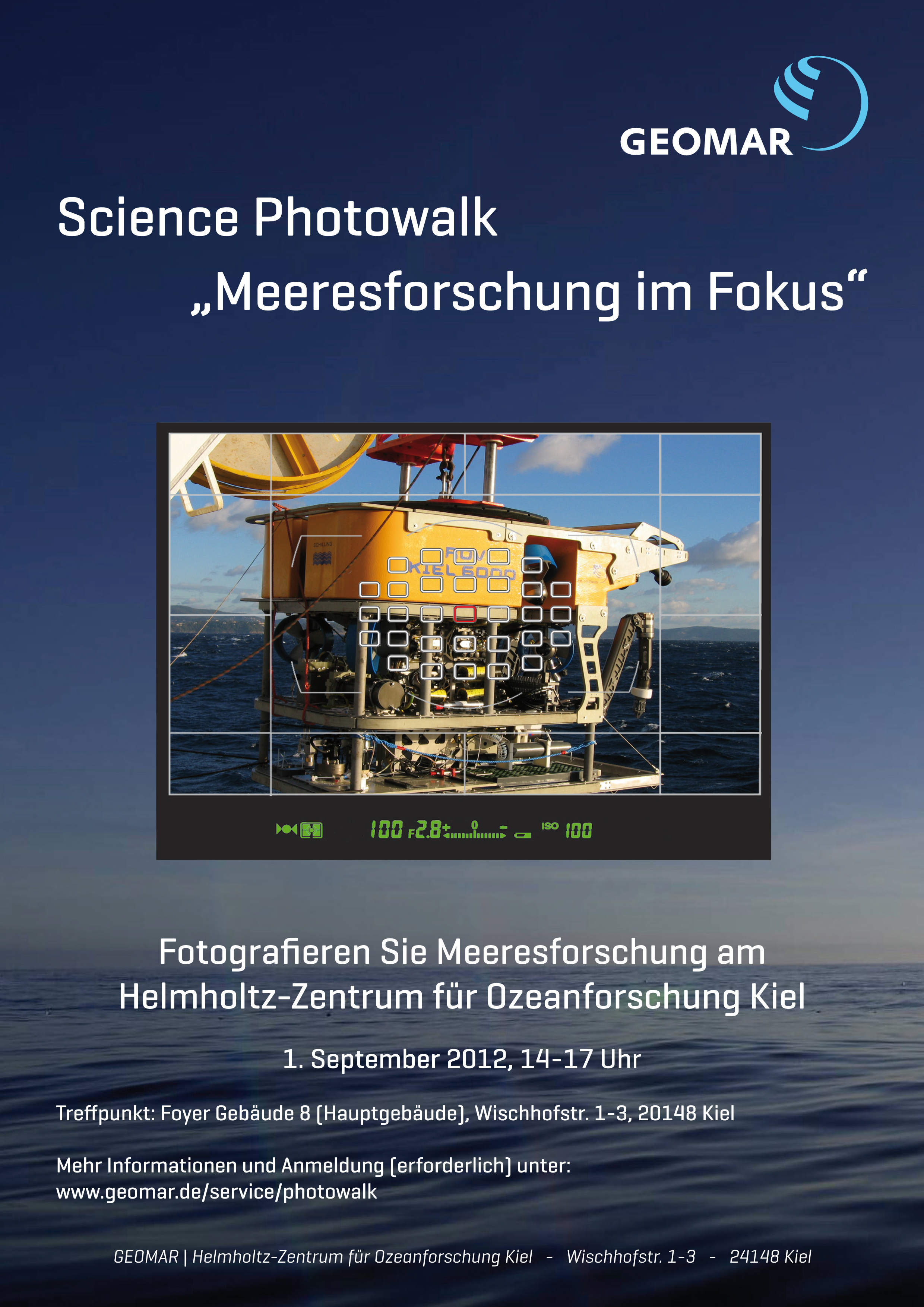 15.08.2012/Kiel. Das GEOMAR | Helmholtz-Zentrum für Ozeanforschung Kiel lädt am Samstag, dem 1. September zu einem sogenannten Photowalk unter dem Motto „Meeresforschung im Fokus“ ein. Im Rahmen eines geführten Rundgangs können interessierte Fotoamateure den Standort Ostufer kennenlernen und aus ihrem eigenen Blickwinkel frei fotografieren. Die Ergebnisse werden im Rahmen einer Ausstellung im Herbst 2012 präsentiert. Die besten Bilder werden durch eine Jury ausgewählt und prämiert. Diese werden dann auch bei einem internationalen Wettbewerb, dem „Global Science Photowalk 2012“, eingereicht. Die Teilnahme am Photowalk ist kostenlos, aber eine Anmeldung ist erforderlich.