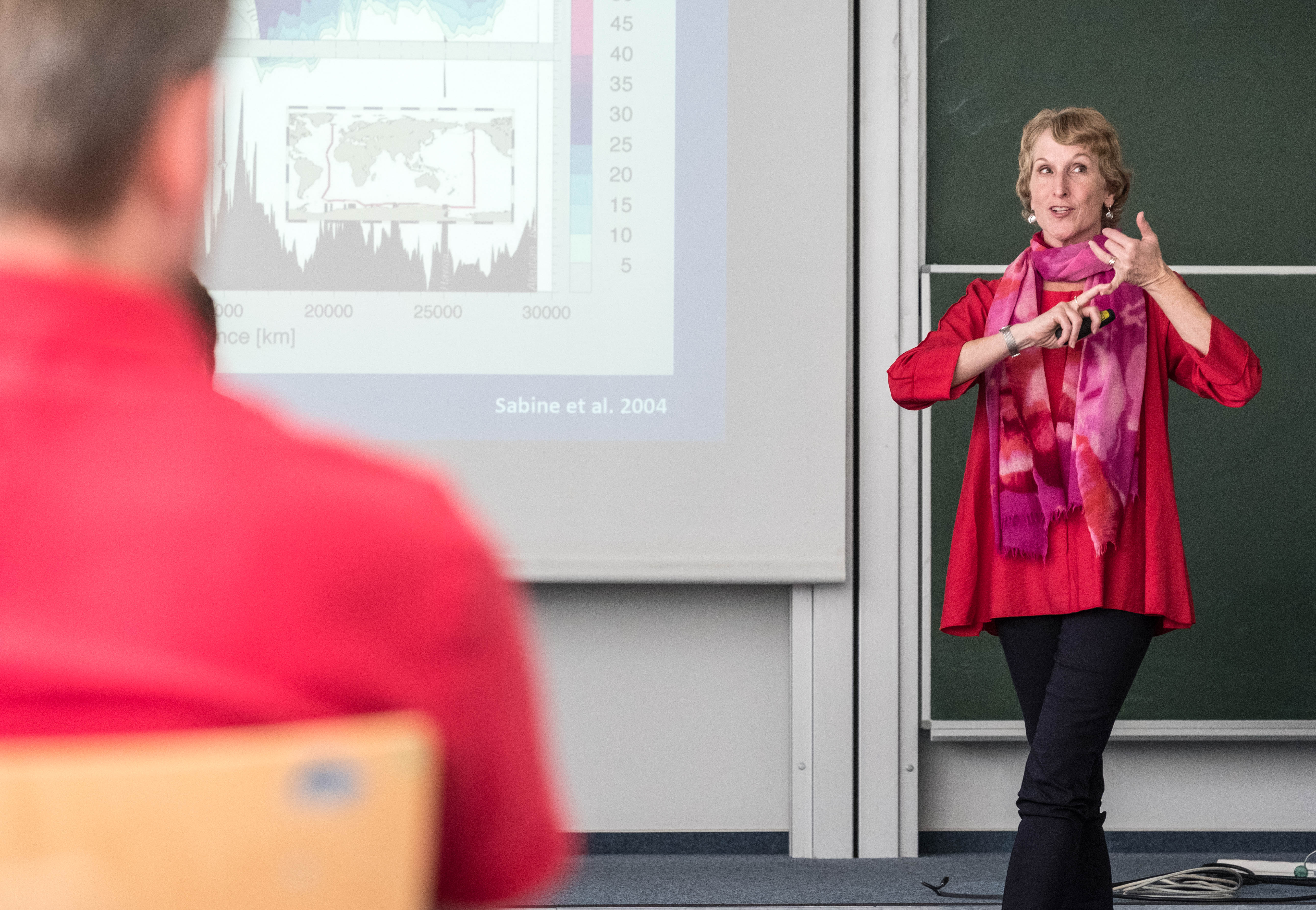Professor Lozier stellte in ihrem Vortrag faszinierend dar, was über die globale Ozeanzirkulation und insbesondere über die Umwälzbewegungen im Atlantik heutzutage bekannt ist. Dabei beleuchtet sie insbesondere auch die historische Entwicklung und die vielen Überraschungen und Fragezeichen, die es auch heute noch gibt. „Für ein besseres Verständnis der Prozesse fehlen uns insbesondere mehr Beobachtungen aus dem tiefen Ozean“, erläutert Prof. Lozier. „Deshalb haben wir das international koordinierte Beobachtungsprogramm OSNAP konzipiert, das in den kommenden Jahren wichtige Informationslücken schließen soll“, so Lozier weiter. Die ersten Ergebnisse sind bereits sehr vielversprechend und werden im Herbst dieses Jahres zur Veröffentlichung eingereicht. „Wir wissen über den Ozean noch viel weniger als über die Atmosphäre“, erklärt Professorin Katja Matthes vom GEOMAR. „Der Ozean ist aber gerade für anthropogene Klimaänderungen ein wichtiger Faktor, da er ein viel längeres Gedächtnis als die Atmosphäre hat“, so Professorin Matthes weiter. Eine Zusammenarbeit von Physikalischen Ozeanographinnen wie Susan Lozier mit Ozean- sowie Klimamodellierern hier am GEOMAR ist daher essentiell, um die Rolle des Ozeans im Klimawandel besser zu verstehen.