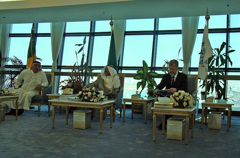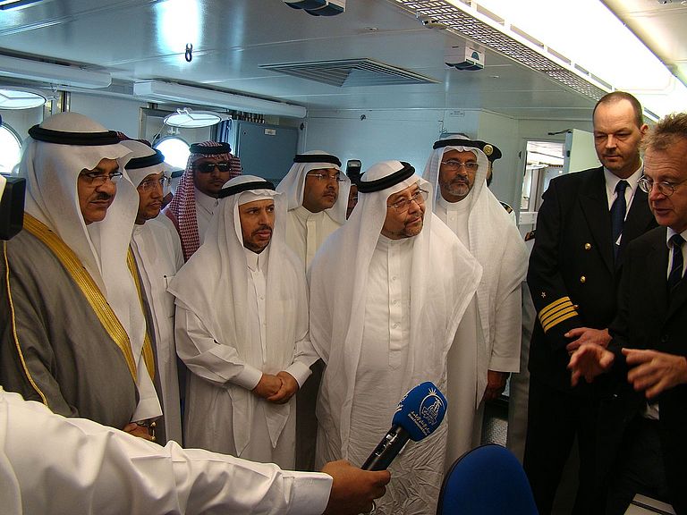 Neben dem Präsidenten der King Abdulaziz University, seine Exzellenz Prof. Osama Tayyeb, dem stellvertretenden Präsidenten der Universität und dem Leiter des JeddahTransectSteeringCommittees, Prof. Ali Aidaroos, besuchten weitere hochrangige Persönlichkeiten das Forschungsschiff POSEIDON. Präsident Tayyeb ließ sich vor Ort von der Schiffsführung und anwesenden Projektmitarbeitern über die geplanten Untersuchungen und das wissenschaftliche Instrumentarium der Poseidon unterrichten. In den kommenden zwei Monaten werden in drei Fahrtabschnitten saudi-arabische und Kieler Meeresforscher gemeinsam biologische, geologische und geophysikalische Studien von der Küste bis zur zwei Kilometer tiefen "Grabenachse" des Roten Meeres durchführen.