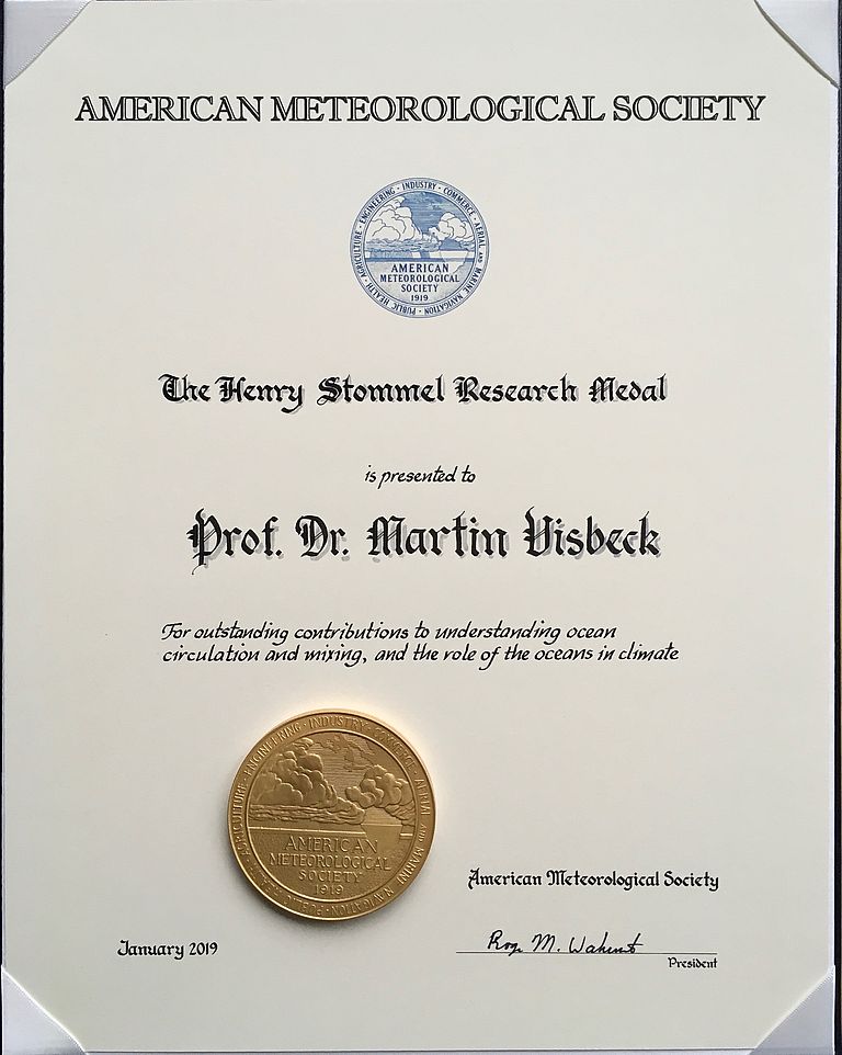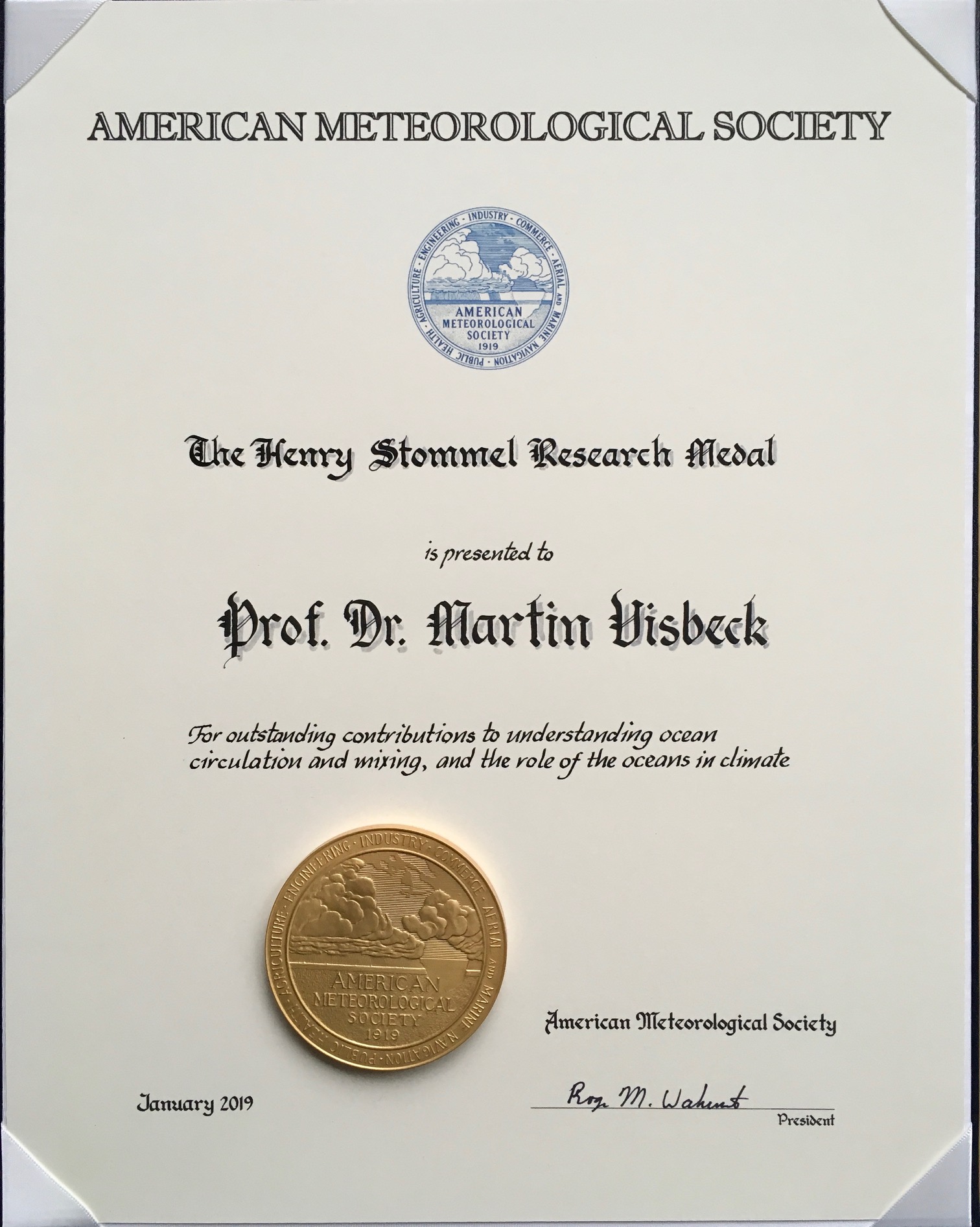 „Ich fühle mich außerordentlich geehrt und freue mich, diese hohe Auszeichnung heute persönlich entgegen nehmen zu können“, sagte Prof. Martin Visbeck, anlässlich der Preisverleihung, die im Rahmen der 99. Jahrestagung der Amerikanischen Meteorologischen Gesellschaft, in Phoenix, Arizona, USA stattfand. „Mein Dank geht auch an mein Team am GEOMAR in Kiel und vielen internationalen Kolleginnen und Kollegen, mit dem ich in den vergangenen Jahren so erfolgreich Forschung betreiben konnte“, so Visbeck weiter. „Es ist für mich eine besondere Ehre, als zweiter Deutscher nach meinem Lehrer und Doktorvater Friedrich Schott mit dieser Medaille ausgezeichnet zu werden“, so der 55-jährige Kieler Ozeanograph.