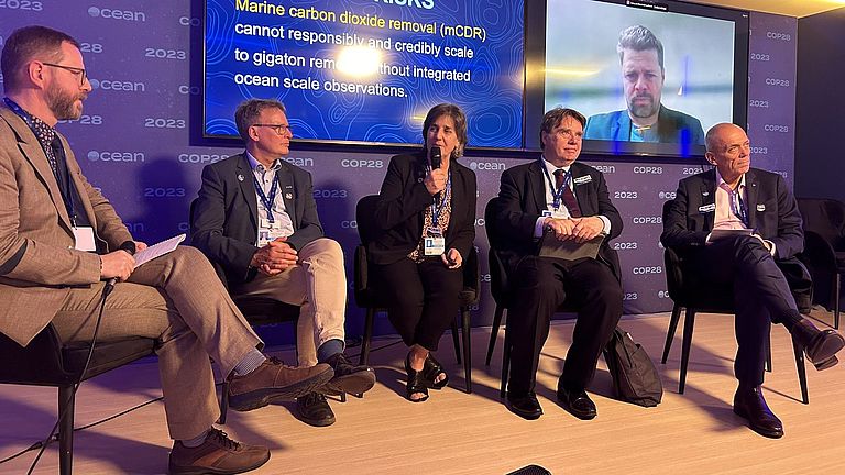 GEOMAR-Forschende diskutierten auf der COP28 mit Delegationen und anderen Stakeholdern wichtige Aspekte ihrer Arbeit, darunter Ozeanbeobachtung, Konzepte für die Kohlendioxid-Aufnahme im Ozean, Sauerstoff im Meer und digitale Ozeanzwillinge als Instrument für wissenschaftsbasierte Entscheidungen. Zum ersten Mal beteiligte sich das GEOMAR am Ozean-Pavillon, einer zentralen Drehscheibe mit mehr als 80 Veranstaltungen, die von der Woods Hole Oceanographic Institution (WHOI) und der Scripps Institution of Oceanography koordiniert wurden. Im Vorfeld der COP28 wurde die Dubai Ocean Declaration von den Pavillonpartnern mit starker Unterstützung des GEOMAR ins Leben gerufen.