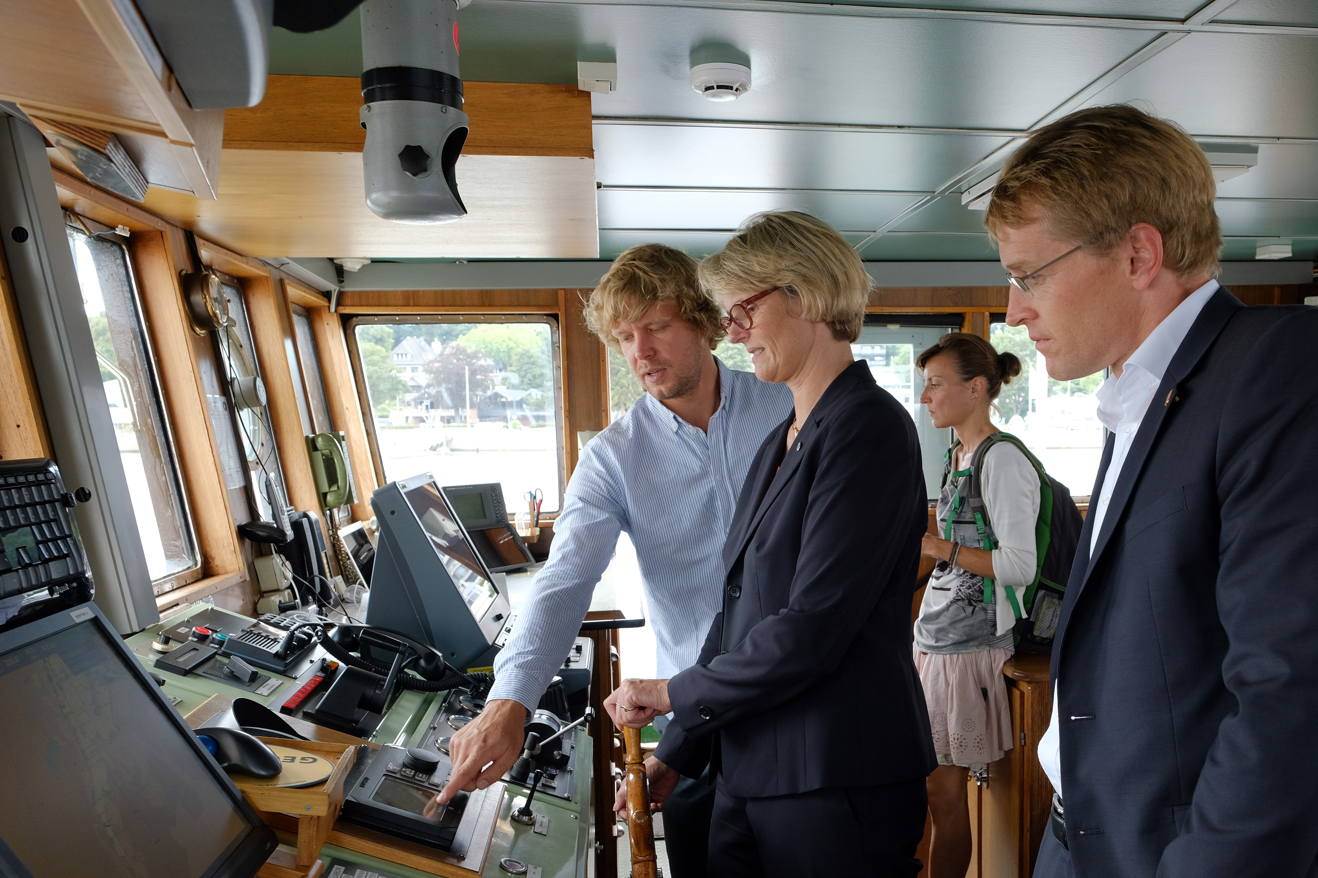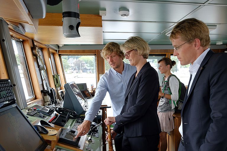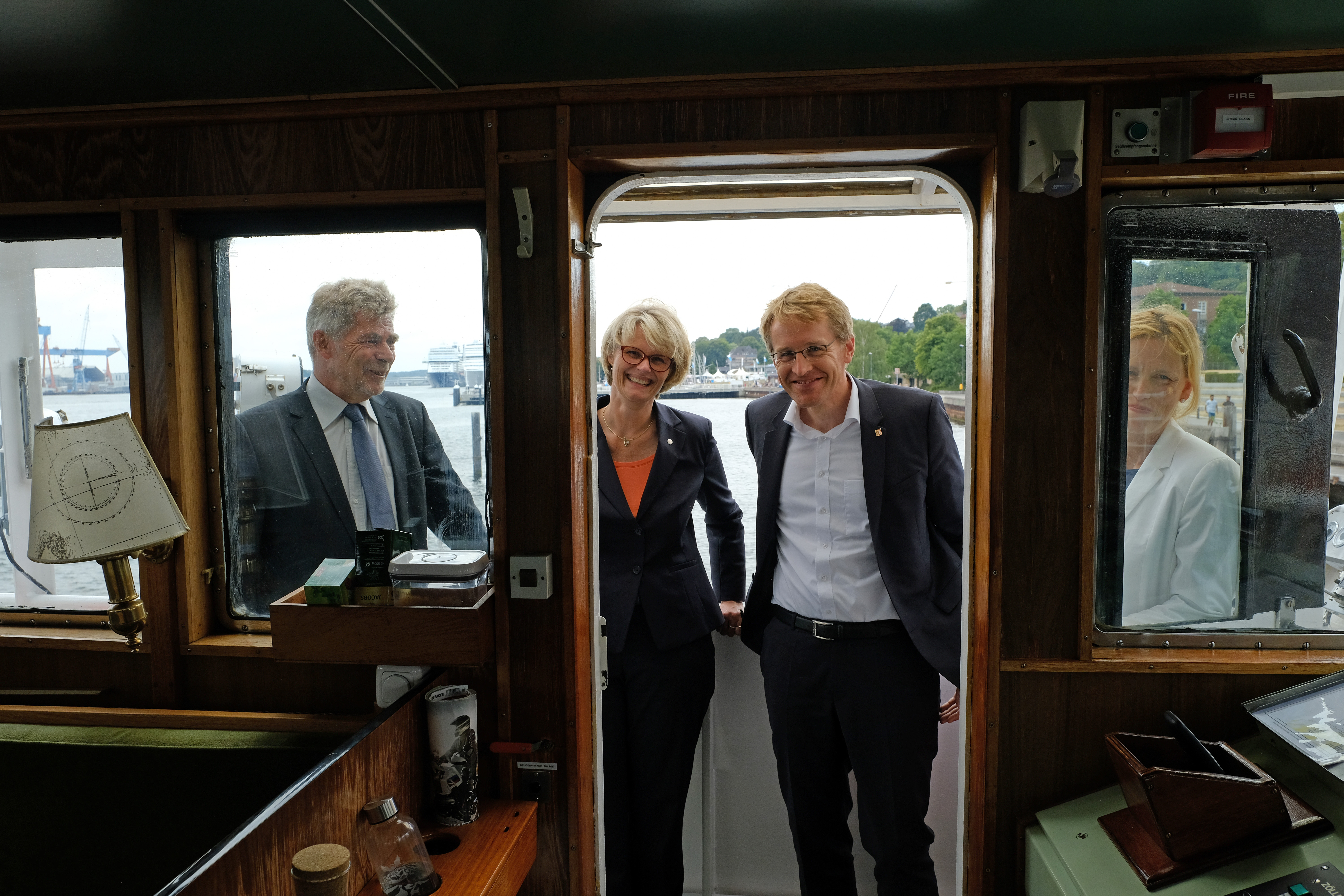Der Einstieg zum Besuch des GEOMAR Helmholtz-Zentrums für Ozeanforschung Kiel konnte für die Bundesministerin für Bildung und Forschung Anja Karliczek nicht passender sein: Auf dem Forschungsschiff LITTORINA überquerte sie in Begleitung von Schleswig-Holsteins Ministerpräsident Daniel Günther und Bildungsministerin Karin Prien die Kieler Förde, um nach politischen Konsultationen das GEOMAR zu besuchen. Am GEOMAR standen neben einer Vorstellung des Portfolios des Forschungszentrums Themen wie die Deutsche Allianz für Meeresforschung und die Zukunft der Deutschen Forschungsflotte auf dem Programm.