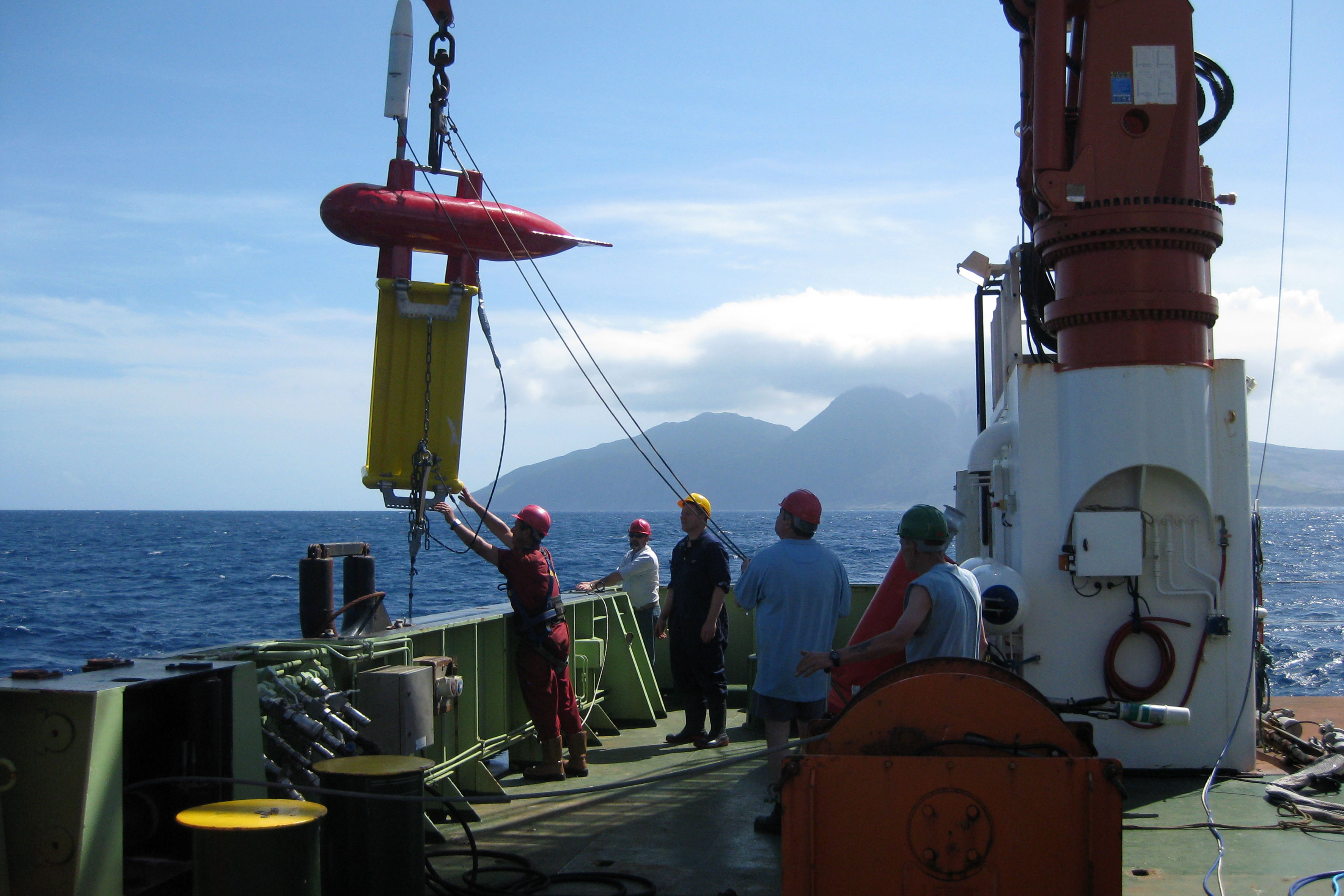 Das P-Cable 3D-Seismik-System wird während der Expedition JC45 mit dem britischen Forschungsschiff RRS JAMES COOK vor der Karbikinsel Montserrat ausgebracht. Foto: J. Karstens, GEOMAR