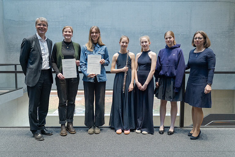 Die Verleihung des Annette-Barthelt-Preises durch Arne Körtzinger an Juliane Tammen und Vanessa Stenvers wurde musikalisch umrahmt von den Jugend-musiziert-Preisträgerinnen Helene Lotte Beyer (Querflöte), Charlotte Hennemann (Klavier) und Luise Starke (Violine). Es gratulierte GEOMAR-Direktorin Katja Matthes (v.l.n.r., nicht im Bild ist die dritte Preisträgerin Mareike Körner).