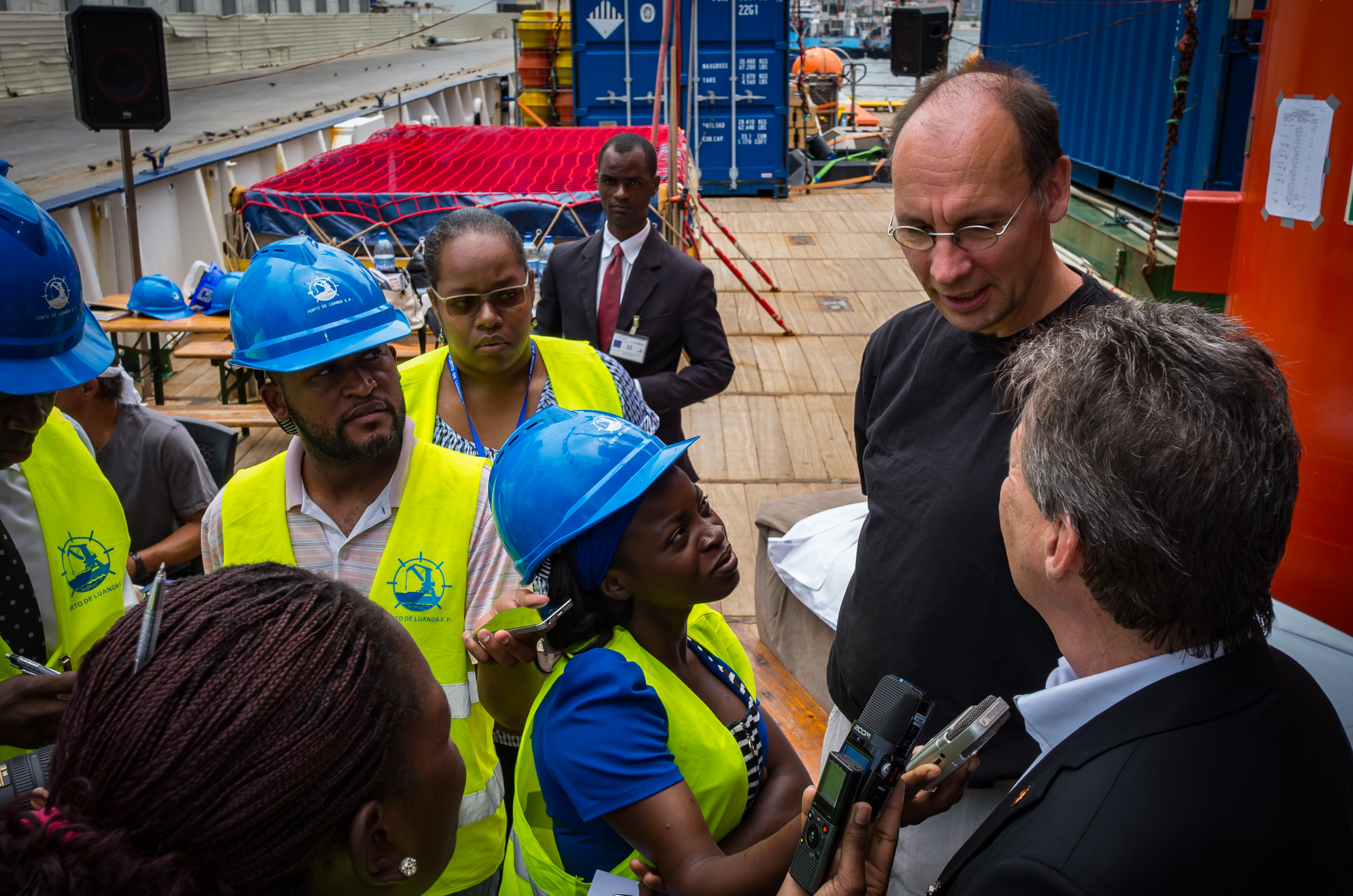 Auch die angolanischen Medien zeigten großes Interesse am Besuch der METEOR. Botschafter Rainer Müller und Fahrtleiter Peter Brandt beantworten Fragen. Foto: SvN
