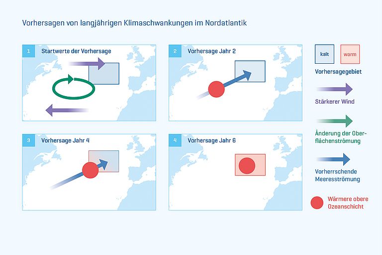 Das Klimasystem unseres Planeten ist komplex. Verschiedene Komponenten, wie Atmosphäre, Ozean, Eis oder Land beeinflussen sich gegenseitig und führen zu natürlichen Klimaschwankungen auf ganz unterschiedlichen Zeithorizonten von Monaten bis zu Jahrzehnten. Insbesondere auf den langen Zeitskalen spielt der Ozean eine zentrale Rolle. In der jetzt vorgelegten Studie unter Federführung des GEOMAR Helmholtz-Zentrums für Ozeanforschung Kiel ist die Möglichkeit untersucht worden, durch Schwankungen des Windfeldes verursachte Änderungen der Meeresoberflächentemperaturen im Nordatlantik über Jahre hinaus vorherzusagen. Solche Schwankungen der Wassertemperatur haben auch das Potential das Klima in Europa zu beeinflussen.