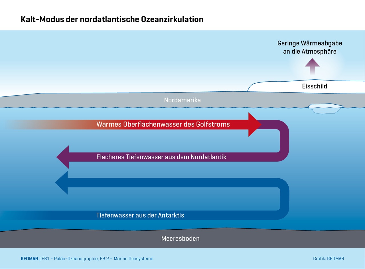 Die Studie in der Fachzeitschrift "Nature" lässt Schlüsse auf die Vergangenheit der sogenannten nordatlantischen Ozeanzirkulation zu: Wissenschaftler des Oeschger-Zentrums für Klimaforschung der Universität Bern, des Instituts für Umweltphysik der Universität Heidelberg, des GEOMAR Helmholtz-Zentrums für Ozeanforschung Kiel und der ETH Zürich konnten belegen, dass die Strömung – entgegen der Erwartungen – relativ stabil war. Nur während kurzer Extremphasen der letzten Eiszeiten war sie schwächer als heute. Die nordatlantische Ozeanzirkulation transportiert warmes Wasser in den Norden und sorgt so für ein verhältnismässig mildes Klima in Europa. Der Zusammenbruch dieser Strömung, welche auch den bekannten Golfstrom mit einschließt, hätte einen drastischen Temperaturrückgang auf dem Kontinent zur Folge. Manche Klimawissenschaftler vermuten, dass ein solches Szenario eintreten könnte, wenn im Zuge des Klimawandels die Eispanzer Grönlands schmelzen. Dabei gelangt vermehrt Süsswasser in den Atlantik, welches die Zirkulation stört.