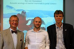 Frau Dr. Ilse Van Opzeeland (31) hat an der Universität Bremen im Fachbereich Biologie ihre Dissertation „Acoustic ecology of marine mammals in polar oceans” promoviert. In ihrer Dissertation hat Frau Dr. Opzeeland mit Hilfe der Unterwasser-Horchstation PALAOA mehrere Jahre die Rufe von Meeressäugern, wie Blau- und Buckelwalen und unterschiedlichen Robbenarten unter dem Eis kontinuierlich aufgezeichnet und ausgewertet. Ihre Langzeitmessungen im Weddellmeer in der Antarktis ermöglichten zum Beispiel erstmals, die Anwesenheit von Blauwalen und Buckelwalen während des antarktischen Winters nachzuweisen. Die Tiere können dort trotz Eisbedeckung überleben. Frau Opzeeland ist jetzt als Bioakustikerin am Alfred-Wegener-Institut für Polar- und Meeresforschung in Bremerhaven beschäftigt.