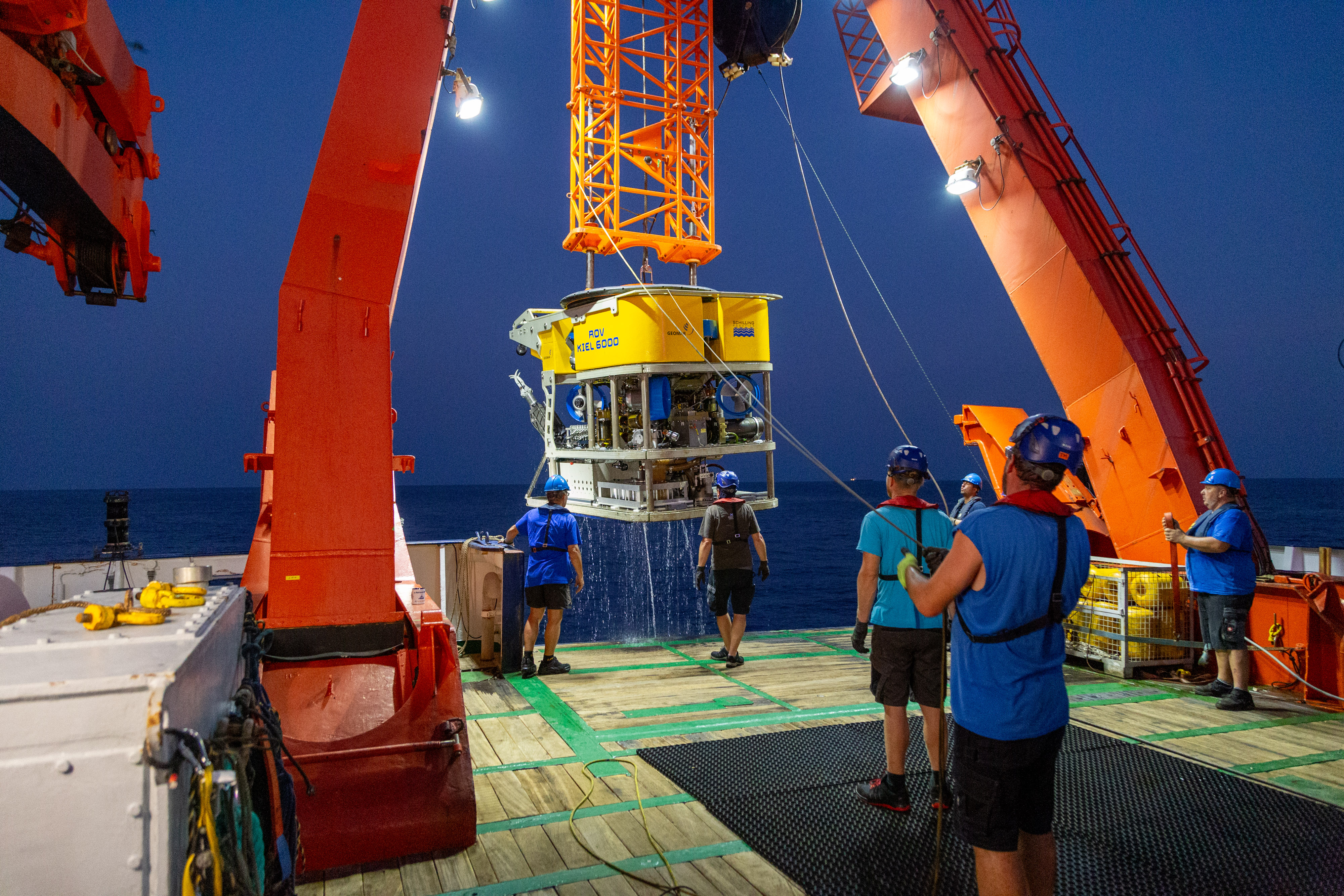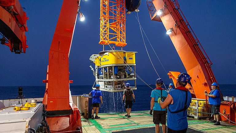 Unterwasserfahrzeuge wie das ROV KIEL 6000 kommen für detaillierte Untersuchungen des Lebensraumes Tiefsee und seiner Rohstoffe in Frage. Ihr Einsatz wird erst durch die vorherige schiffsgestützte Kartierung des Meeresbodens per Fächerecholot möglich. Allerdings wurden bislang erst weniger als fünfundzwanzig Prozent des Tiefseebodens auf diese Weise kartiert. Mithilfe künstlicher Intelligenz sollen nun Vorhersagekarten für größere Bereiche erstellt werden. Foto: David Diekrup/GEOMAR