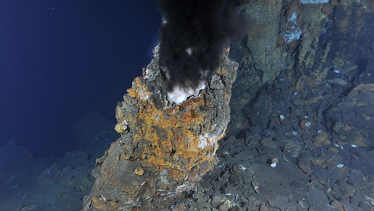 Schwarze Raucher wie dieser am Vulkan Niua im so genannten Lau Becken im Westpazifik bieten einzigartige Lebensräume. Diese sind noch weitgehend unerforscht, dennoch machen wirtschaftliche Interessen menschliche Eingriffe in der Tiefsee in der Zukunft erwartbar. Das Projekt KIMERA wird künstliche Intelligenz nutzen, um Tiefseeboden automatisch zu klassifizieren und Entscheidungsgrundlagen für die Ausweisung von Schutz- und Lizenzgebieten bereitzustellen. Foto: ROV-Team/ROPOS