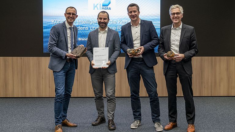 Für das Projekt KIMERA überreichte Digitalisierungsminister Dirk Schrödter einen Förderbescheid in Höhe von 683.000 Euro an Projektleiter Dr. Philipp Brandl vom GEOMAR und Jann Wendt vom Kieler Geodatenspezialisten north.io GmbH. GEOMAR-Verwaltungsdirektor Frank Spiekermann gratulierte (v.l.). Foto: Sarah Kaehlert/GEOMAR