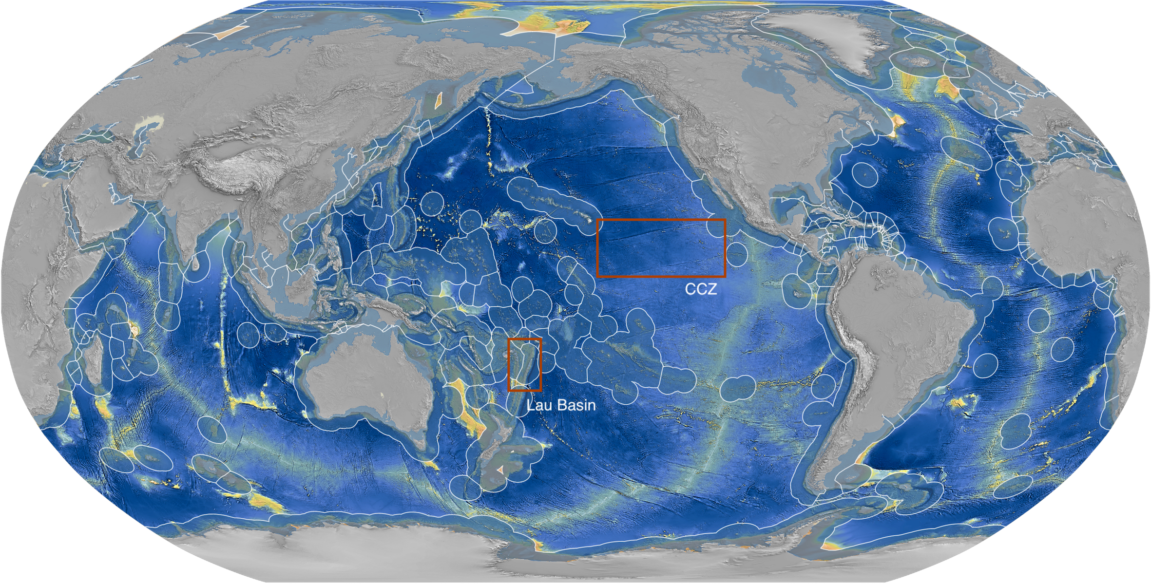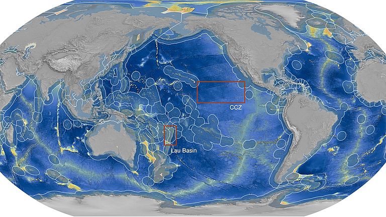 Anhand schiffsgestützter Kartierungen soll im Projekt KIMERA in den beiden markierten Gebieten, der Clarion-Clipperton Zone im östlichen Pazifik sowie dem Lau-Becken zwischen den Inselstaaten Fidschi und Tonga, als Pilotversuch eine KI an der geologischen Klassifizierung des Meeresbodens und seiner Habitate trainiert werden. Karte: Sven Petersen/GEOMAR