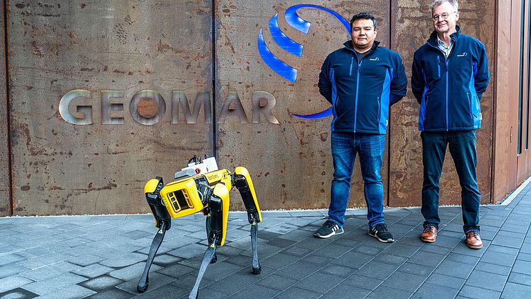 Der Roboterhund SPOT ist mit einem hochempfindlichen Multigas-Sensor ausgerüstet, den Roberto Benavides (l.) ursprünglich für Unterwasseranwendungen entwickelt hat. Initiiert hat das Projekt SPOT-KI Warner Brückmann (r.), der die Idee hatte, Robotik, Sensorik und KI für Sicherheitsanwendungen zu verknüpfen. Foto: Sarah Kaehlert/GEOMAR