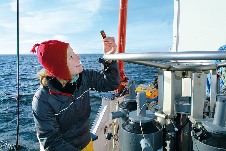 Probennahme auf der LITTORINA: Das GEOMAR betreibt die weltweit größte Datenbank für N2O-Messungen aus dem Ozean. Foto: Annette Kock