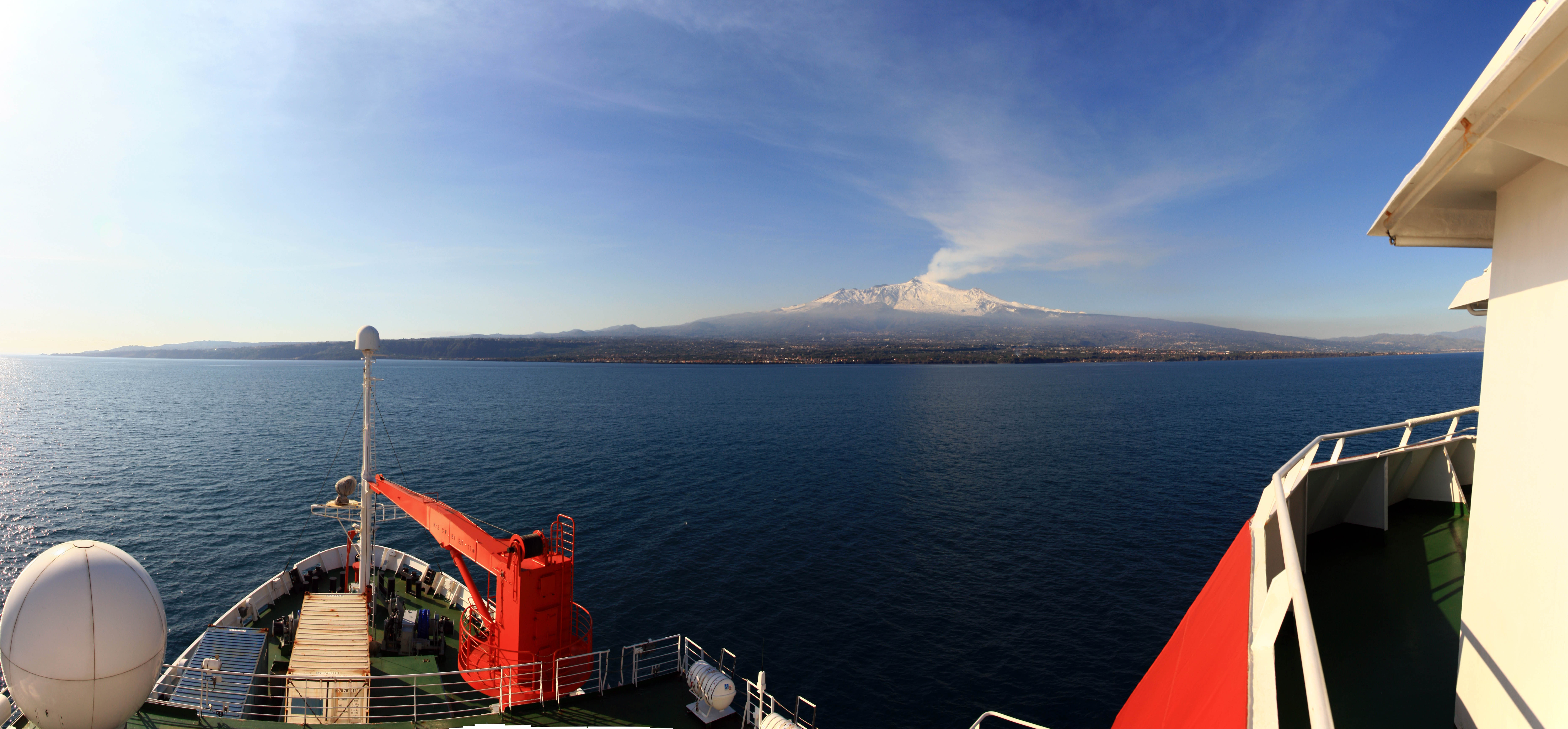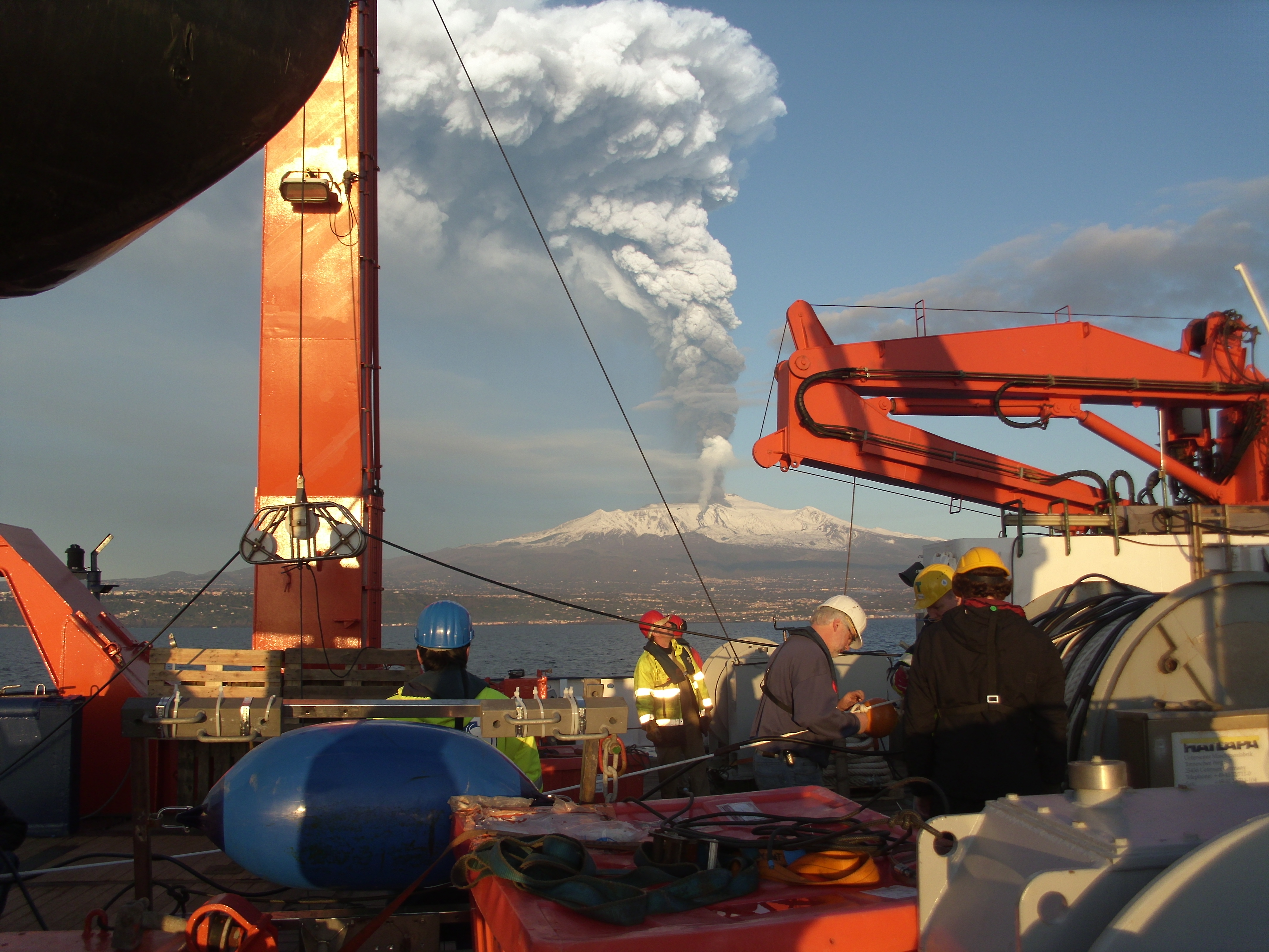 Expedition mit dem Forschungsschiff METOER in die Straße von Messina vor Sizilien zur Untersuchung von submarinen Naturgefahren im Mittelmeer. Im Hintergrund, Vulkanausbruch des Ätna. Foto: Julio Beier, Future Ocean