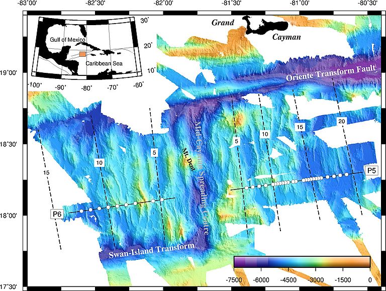 Eine dieser Zonen liegt im Cayman Trog südlich der Insel Grand Cayman in der Karibik. Die Forscherinnen und Forscher haben dort im Jahr 2015 während der Expedition M115 mit dem deutschen Forschungsschiff METEOR den Meeresboden mit Hilfe von Schallwellen – also seismisch – untersucht. Schickt man Schallwellen durch verschiedene Gesteine, verraten die Reflektionen etwas über die Zusammensetzung der einzelnen Schichten. Gestein, das aufgeschmolzen und am Meeresboden wieder fest wurde, hat eigentlich eine andere Signatur als Gestein aus dem Erdmantel, das ohne Schmelzvorgang an die Oberfläche kommt.
