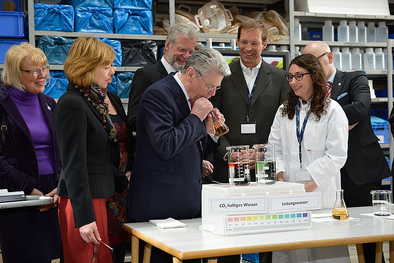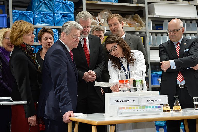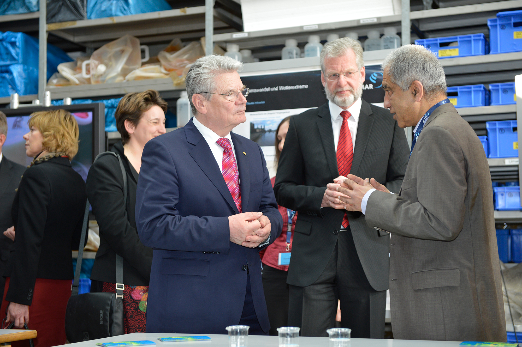 In Begleitung von Daniela Schadt und Ministerpräsident Torsten Albig nahmen auch Kiels Oberbürgermeisterin Susanne Gaschke und Stadtpräsidentin Cathy Kietzer als Vertreterinnen der Landeshauptstadt am GEOMAR-Besuch teil. Besonders breiten Raum nahm im Programm der Schwerpunkt „Ozean und Klima“ ein. Wissenschaftler des GEOMAR gaben dem Bundespräsidenten Einblicke in die Klimageschichte, in aktuelle Messverfahren und zukünftige Entwicklungen im Zusammenhang mit dem globalen Wandel. Hier spielen neben den direkten Auswirkungen der Erderwärmung auch indirekte Prozesse wie die Ozeanversauerung eine wichtige Rolle, die noch weithin unbekannte Konsequenzen für das marine Ökosystem haben.