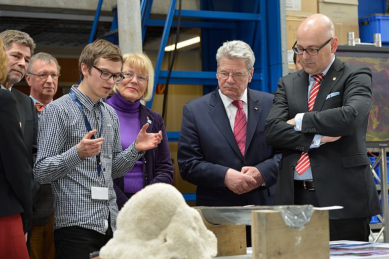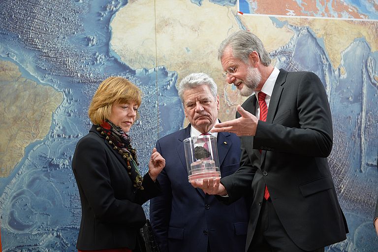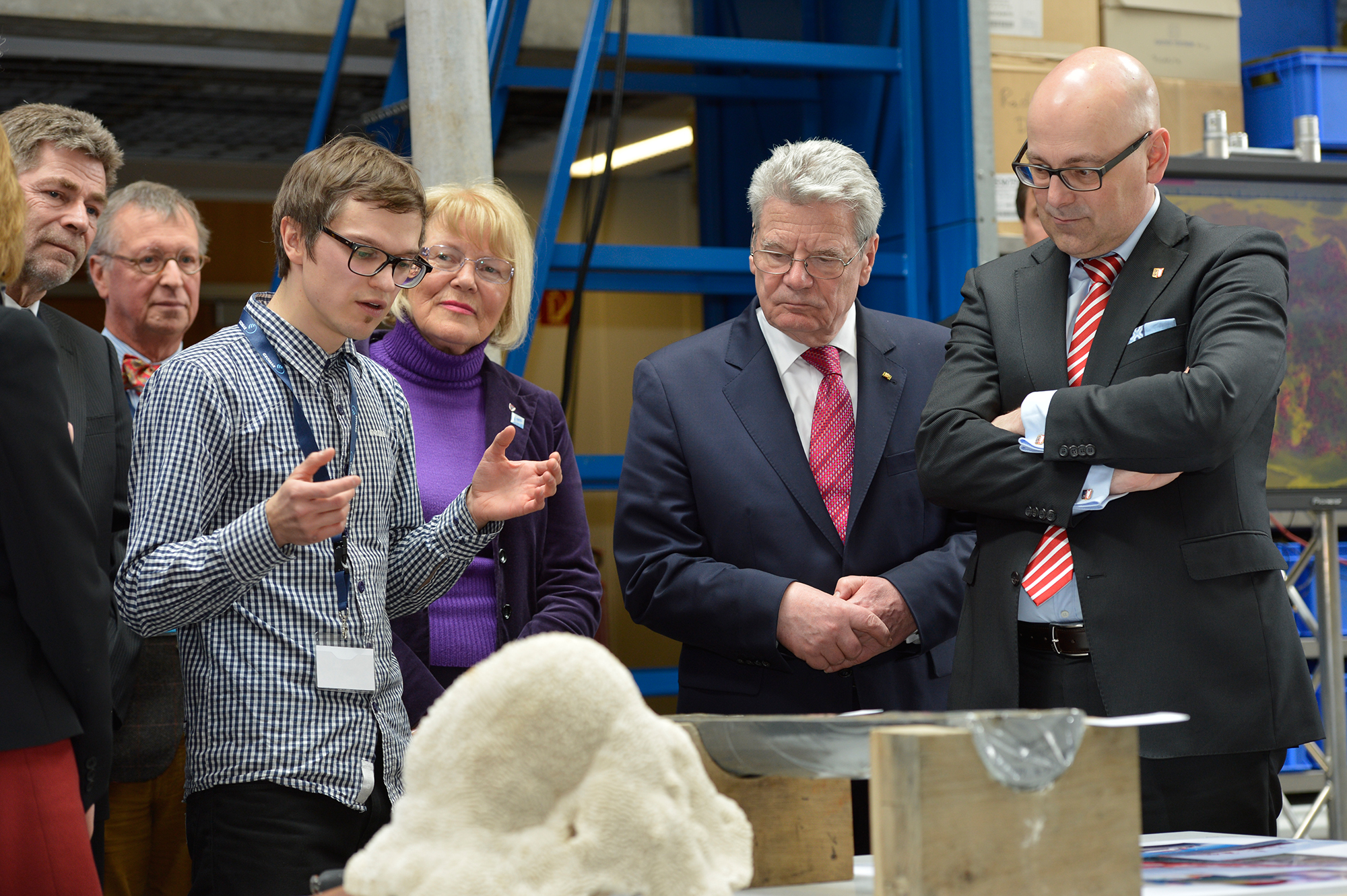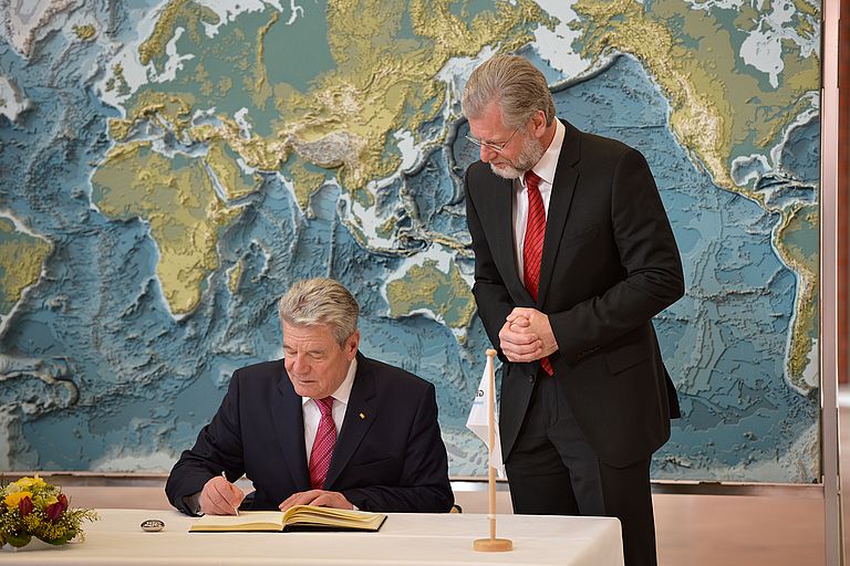 Bundespräsident Gauck zeigte sich beeindruckt von der inhaltlichen Bandbreite des Forschungsspektrums am GEOMAR sowie der Tatsache, Brücken von der Grundlagenforschung bis zu angewandten, gesellschaftlich relevanten Fragestellungen zu schlagen. Er betonte weiterhin die Wichtigkeit, die Forschungsergebnisse auch der Öffentlichkeit zu vermitteln und den Menschen die Bedeutung und Relevanz zu erklären. Abschließend wünschte der Bundespräsident dem GEOMAR und seinen Mitarbeiterinnen und Mitarbeitern für ihre zukünftige Arbeit viel Erfolg und gutes Gelingen.