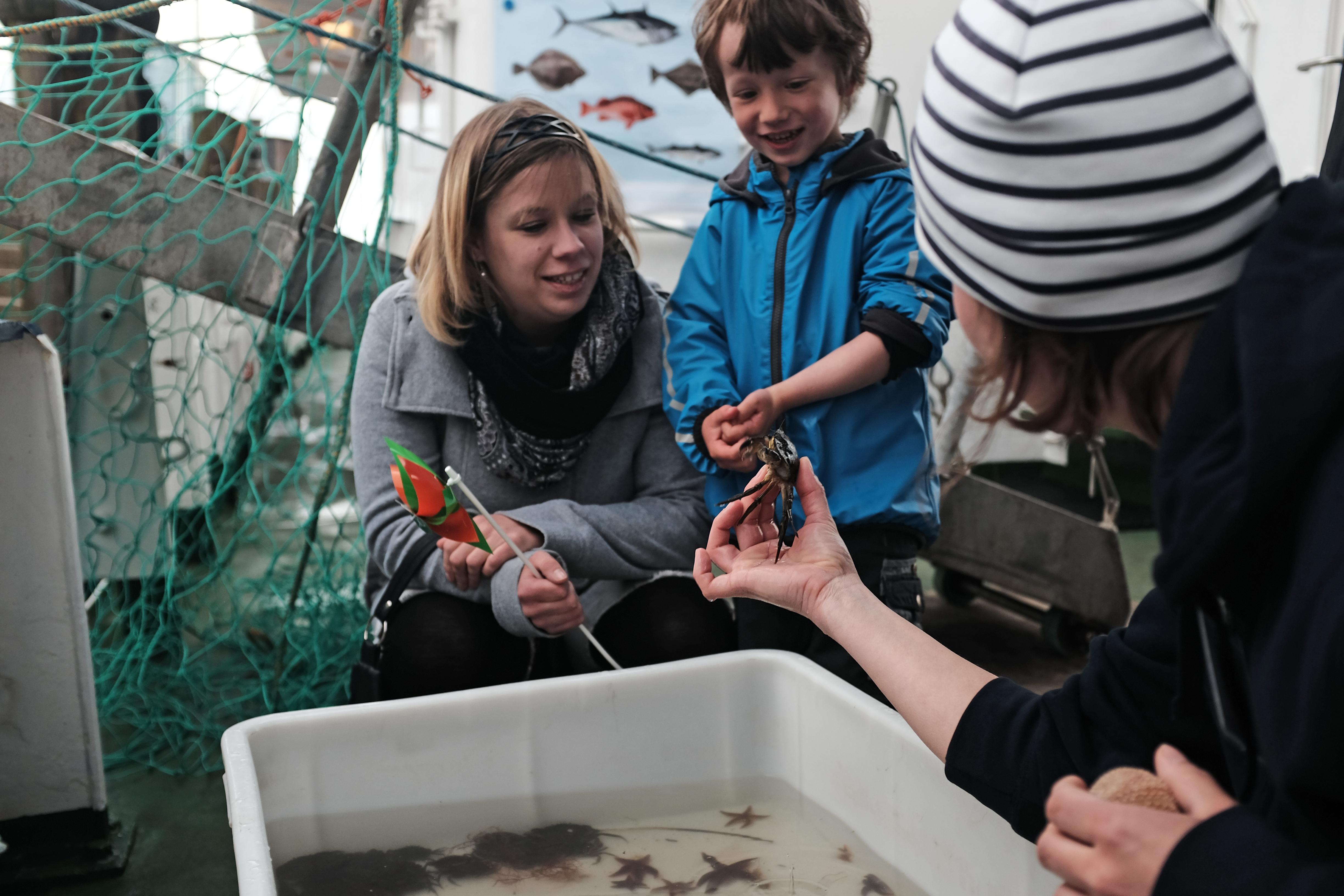 Große und kleine Nachwuchswissenschaftler kommen beim Open Ship auf dem Forschungsschiff LITTORINA voll auf ihre Kosten: Seesterne, Krabben und weitere Meeresbewohner können beobachtet und sogar auf die Hand genommen werden.