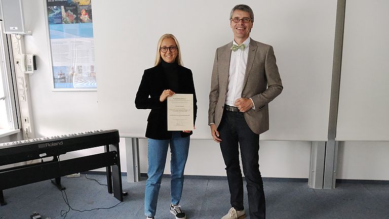 Lena Holtmanns mit ihrer Masterarbeit zur räumlichen Verteilung von vier Seevogelarten im Juni 2019 in der Deutschen Bucht (Nordsee). Der Titel lautet „Analysis of the spatial distribution of seabirds, fish and plankton in the German Bight” (Analyse der räumlichen Verteilung von Seevögeln, Fischen und Plankton in der Deutschen Bucht). In der Arbeit wurde der Einfluss von verschiedenen Variablen, wie zum Beispiel Wassertemperatur, Salzgehalt, Fisch- oder Zooplanktonvorkommen, auf die Seevogelverteilung untersucht. Sie wurde unter der Betreuung von Dr. Jens Floeter am Fachbereich Biologie der Universität Hamburg angefertigt. Es fand zudem eine Zusammenarbeit mit dem Zweitprüfer Dr. Kai Borkenhagen vom Forschungs- und Technologiezentrum (FTZ) der Universität Kiel statt.