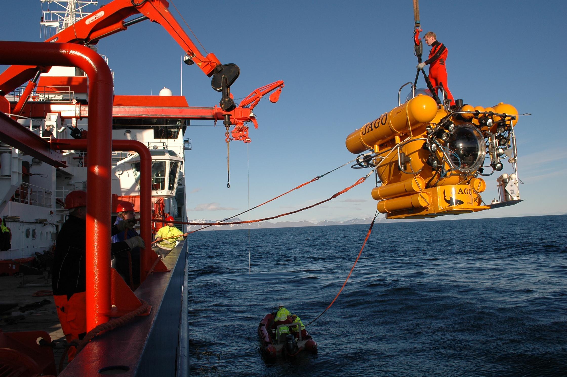 Das Tauchboot Jago wird vor der Küste Spitzbergens vom Forschungsschiff MARIA S. MERIAN aus ins Wasser gelassen. Foto: Karen Hissmann, GEOMAR
