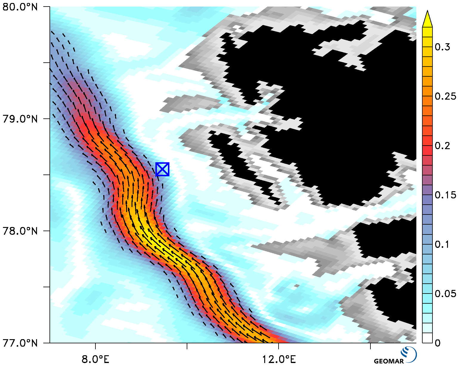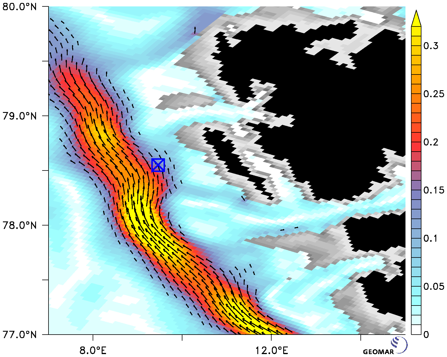 Um zu überprüfen, ob die während der vierwöchigen Expedition gemessenen Schwankungen zufällige Beobachtungen waren oder auf typischen, immer wieder auftretenden Prozessen beruhen, haben Ozeangraphen des GEOMAR die Region im Nachhinein mit einem hochauflösenden Ozeanmodell genauer betrachtet. „So haben wir tatsächlich herausgefunden, dass die beobachteten Schwankungen der ozeanographischen Daten und der Bakterien-Aktivitäten auf immer wiederkehrende Änderungen des West-Spitzbergenstroms zurückzuführen sind“, erläutert Prof. Dr. Arne Biastoch vom GEOMAR. Der West-Spitzbergenstrom ist eine relativ warme, salzhaltige Strömung, die Wassermassen vom europäischen Nordmeer in den Arktischen Ozean transportiert. „Er verläuft meist sehr nah an der Küste. Schwankungen in den Strömungen sorgen aber dafür, dass er oft mäandriert. Dann entfernt sich die Strömung innerhalb weniger Tage etliche Kilometer weit von der Küste weg“, erklärt Professor Biastoch weiter.
