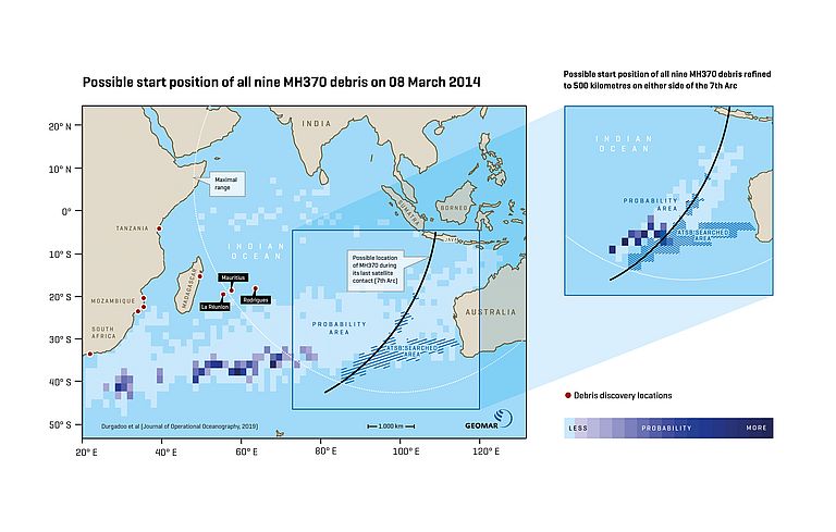 Im Fall von MH370 haben die Forschenden ihre erste Analyse, die auf einer auf La Réunion gefundenen Flügelklappe 2015 basierte, erweitert und auch weitere Trümmerteile, die später entdeckt wurden, mit einbezogen. Trotz der Berücksichtigung dieser Wrackteile, konnte das Absturzgebiet aber nicht signifikant eingegrenzt werden. Deshalb gehen die Wissenschaftlerinnen und Wissenschaftler davon aus, dass hierfür mehr Kenntnisse über die Auftriebseigenschaften der angespülten Teile notwendig sind. Ferner spielt die Unsicherheit, wieviel Zeit zwischen dem Anspülen der Wrackteile an Land und deren Fund vergangen ist, eine wichtige Rolle. „Leider stehen uns solche Informationen nicht zur Verfügung. Unsere gegenwärtigen Prognosen deuten darauf hin, dass genaue Informationen über mindestens fünf Gegenstände notwendig ist, um das Absturzgebiet hinreichend einzugrenzen“, betont Prof. Dr. Arne Biastoch, Teamleiter vom GEOMAR.
