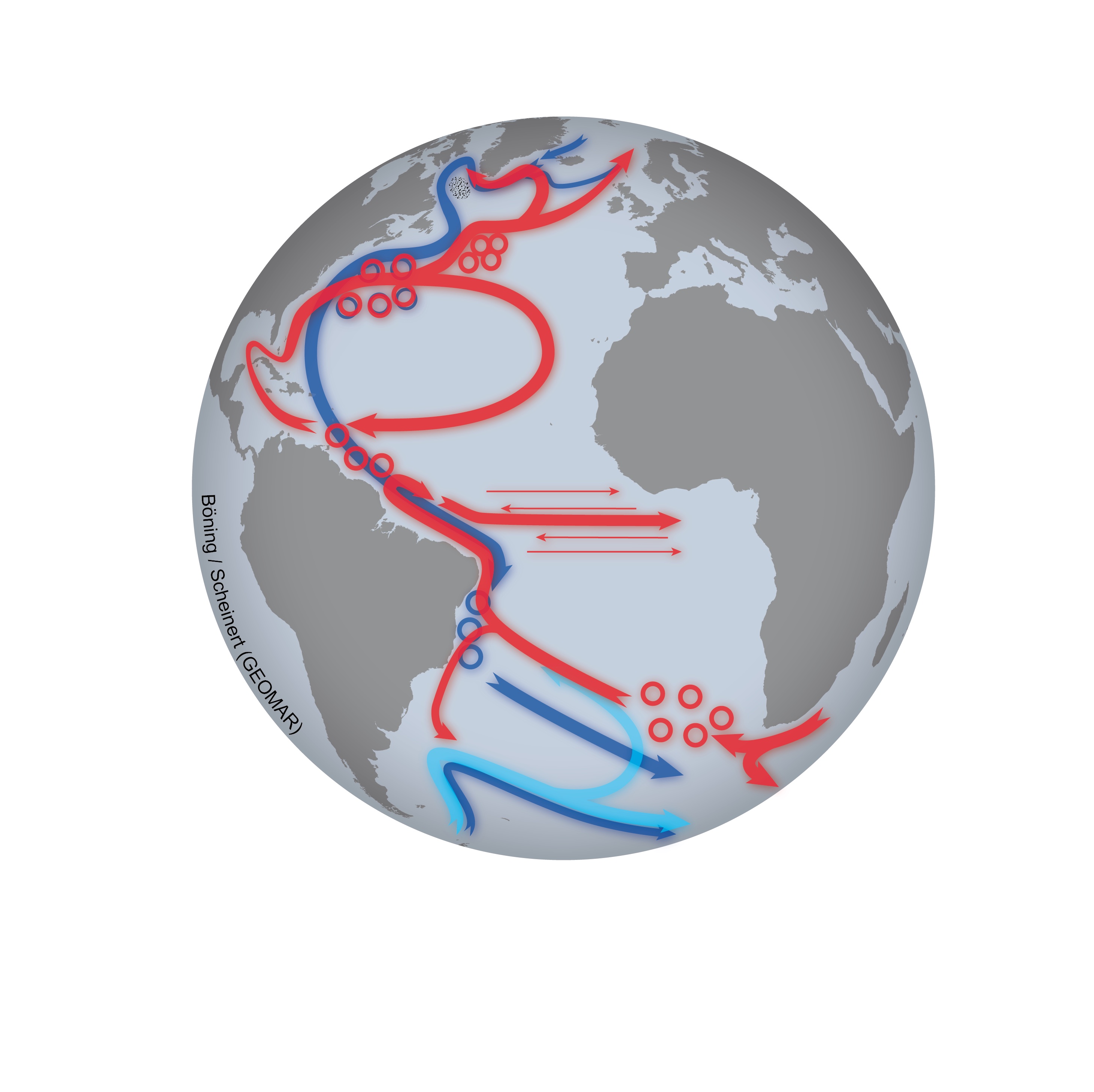 Zu den größten Klimamaschinen weltweit gehören die mächtigen Meeresströmungen, die sich unaufhörlich durch den Atlantischen Ozean wälzen. Südlich und östlich von Grönland taucht kaltes und aufgrund seines hohen Salzgehalts schweres Wasser ab und strömt in der Tiefe gen Süden. In der Gegenrichtung fließt warmes Wasser an der Meeresoberfläche aus den Tropen gen Norden. Fachleute bezeichnen diese den gesamten Atlantik umspannende Umwälzbewegung als Atlantische Meridionale Umwälzzirkulation (Atlantic Meridional Overturning Circulation, AMOC). Der Golfstrom, der Wärme aus dem Golf von Mexiko quer über den Atlantik nach Europa bringt und uns mildes Klima beschert, ist ein Teil dieser Umwälzbewegung. In den geographischen Breiten, in denen sich diese Wasserwalze besonders schnell bewegt, transportiert sie zusammengerechnet in einer Sekunde fast zwanzigmal mehr Wasser als alle Flüsse der Welt in derselben Zeit ins Meer tragen.