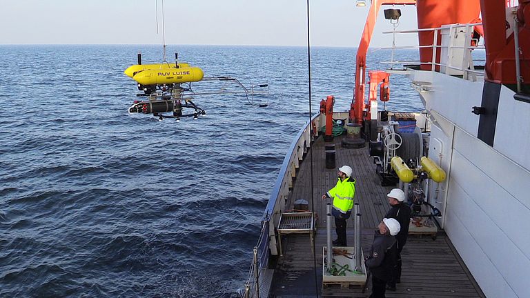 Während der Expedition AL548 im Herbst 2020 wurden mit den autonomen Unterwasserfahrzeugen AUV ANTON und AUV LUISE (im Bild) hoch aufgelöste Fotomosaike von Gebieten mit Munitionsaltlasten in der Ostsee erstellt. Foto: Torsten Frey/GEOMAR