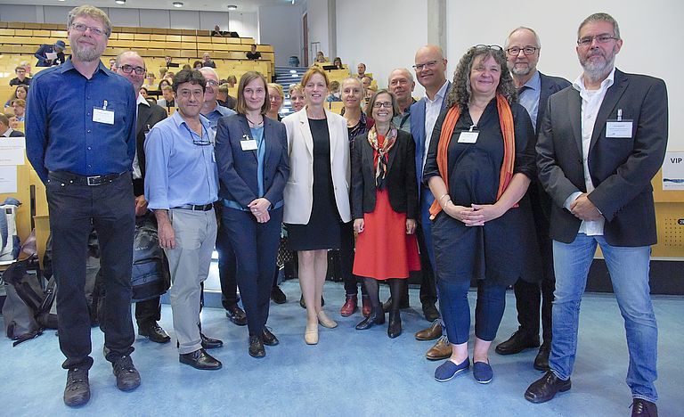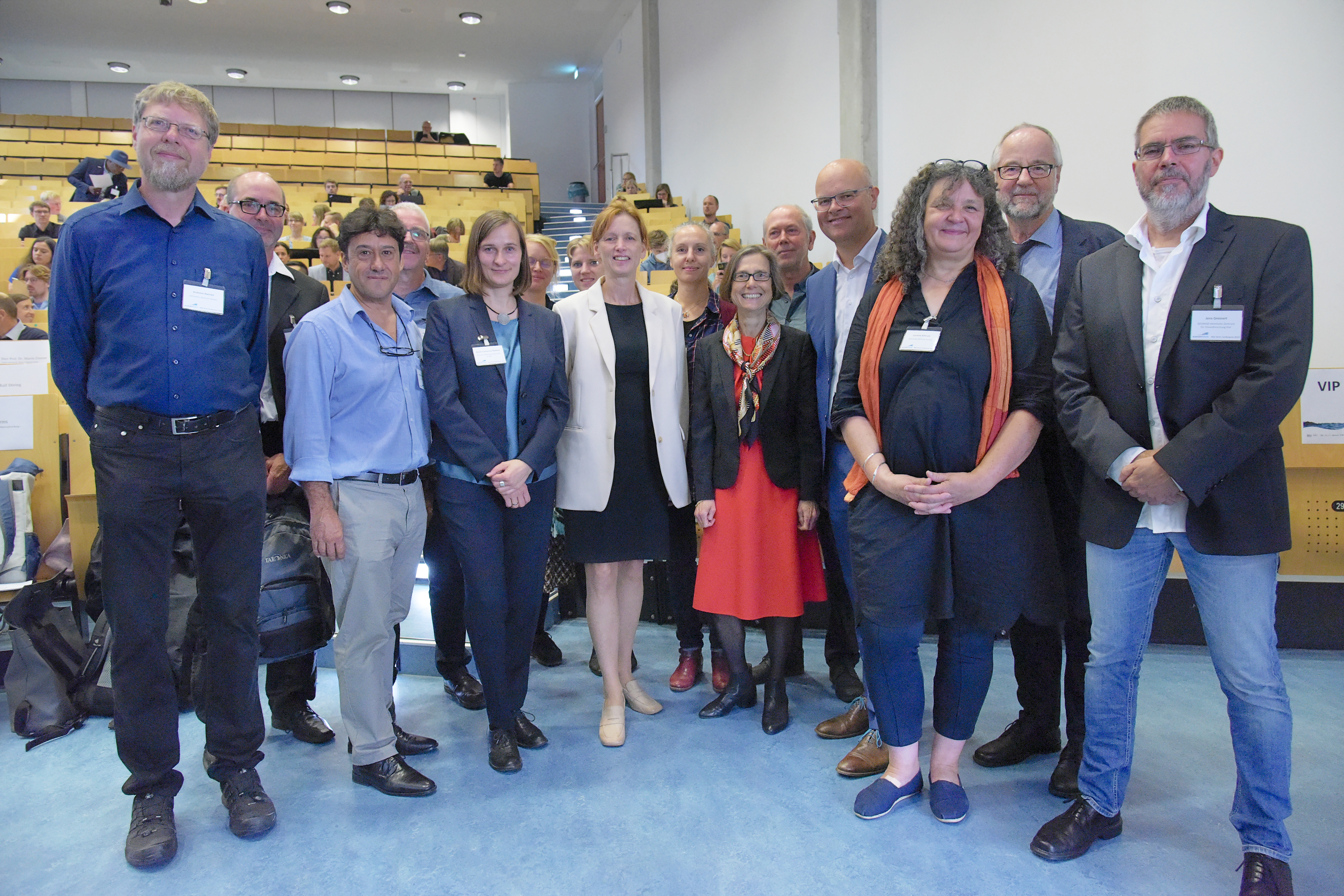 Auftakt zur sustainMare-Jahrestagung an der Uni Kiel zu Zukunftsthemen der Nord- und Ostsee: Karin Prien (4.v.l.), Ministerin für Allgemeine und Berufliche Bildung, Wissenschaft, Forschung und Kultur des Landes Schleswig-Holstein, CAU-Präsidentin Prof. Simone Fulda (5.v.r.), Tobias Goldschmidt (4.v.r.), Minister für Energiewende, Klimaschutz, Umwelt und Natur des Landes Schleswig-Holstein (MEKUN), Prof. Corinna Schrum (3.v.r.) vom Helmholtz-Zentrum Hereon, Sprecherin der DAM-Forschungsmission sustainMare und Leiterin des sustainMare-Projektes CoastalFutures, Dr. Joachim Harms (2.v.r.), Vorsitzender des DAM-Vorstands, im Kreis der Projektleitenden und Organisatorinnen und Organisatoren der Konferenz. Foto: Jürgen Haacks (Uni Kiel)