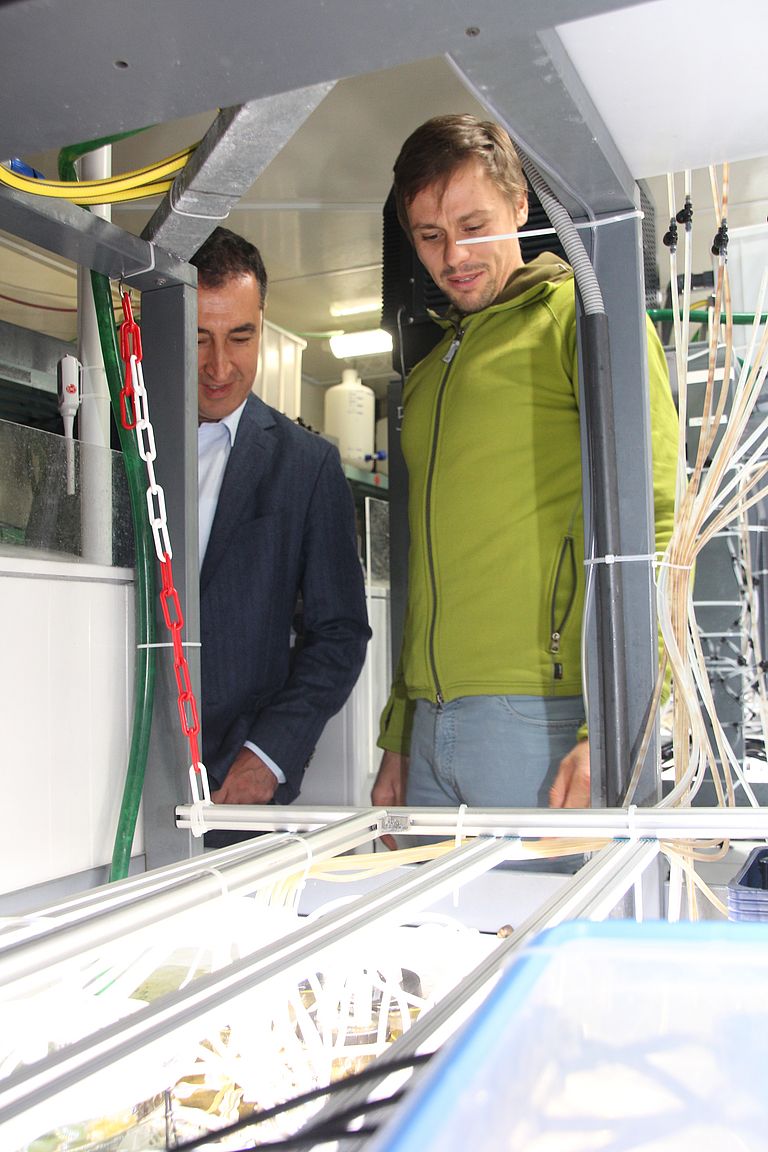 Dr. Christian Pansch erläuert Cem Özdemir den Versuchsaufbau in den Klimakammern. Foto: A. Villwock, GEOMAR.