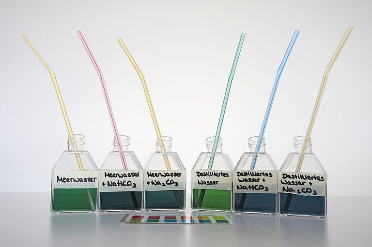 Wie das Wasser versauert, wird anhand eines einfachen Experiments deutlich: Wer Indikatorlösung in ein Gefäß mit Wasser gibt und dann mit einem Strohhalm kohlendioxid-haltige Atemluft hineinbläst, kann anhand der Farbveränderung ablesen, wie der pH-Wert sinkt. „Einige unserer Experimente sind so konzipiert, dass Lehrer sie auch innerhalb kurzer Zeit im Unterricht durchführen und schnell Ergebnisse erzielen können“, erklärt Dr. Sally Soria-Dengg. Die Kieler Meeresbiologin hat die Experimente zusammen mit anderen BIOACID-Partnern entwickelt. "Daneben gibt es aber auch Langzeitversuche, bei denen etwa das Wachstum von Algen in Abhängigkeit vom Kohlendioxid-Gehalt oder die Entwicklung des Kohlendioxid-Niveaus im Klassenraum über eine Unterrichtswoche hinweg analysiert werden."