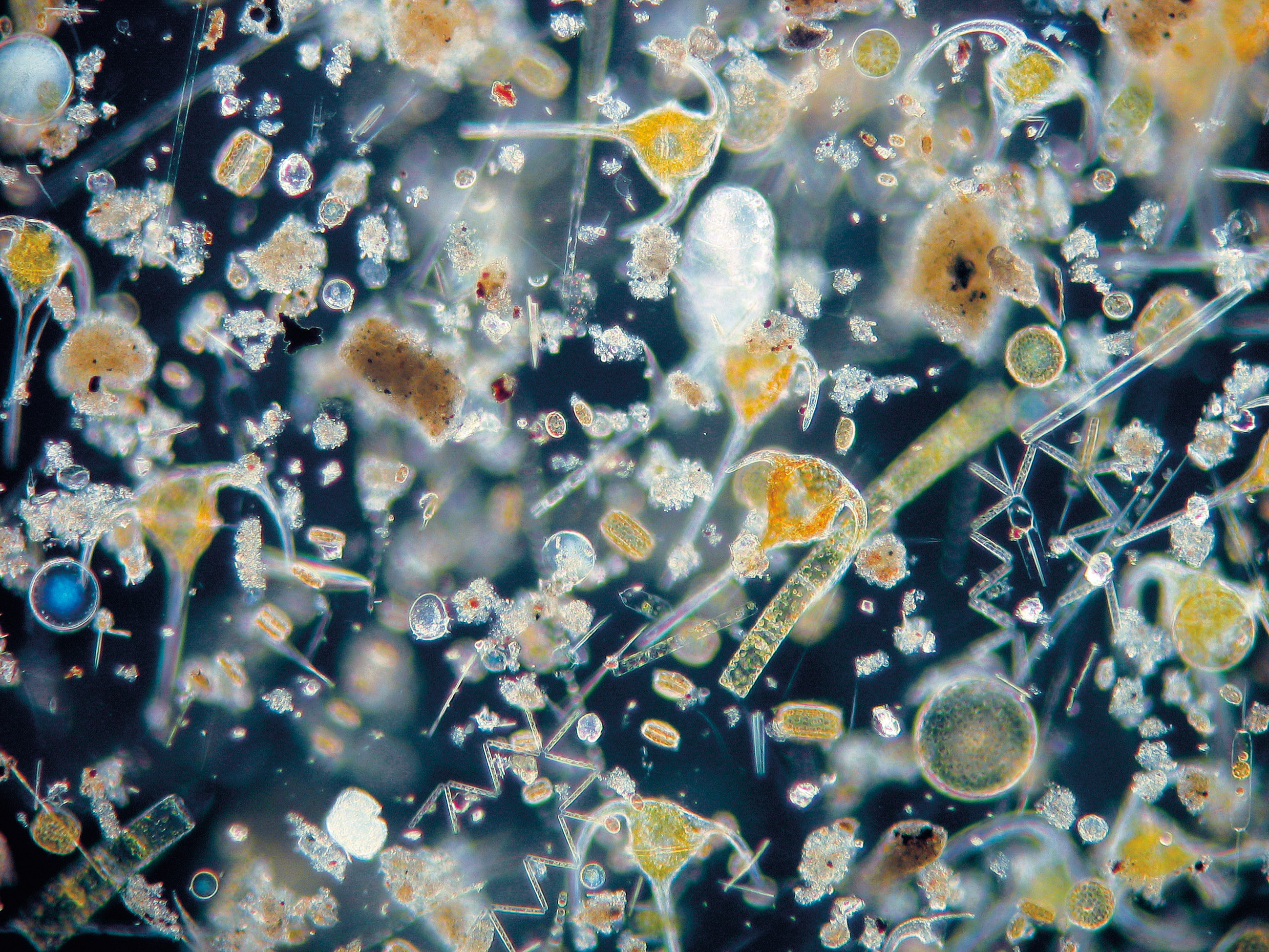 Phytoplanktongemeinschaft unter dem Mikroskop: Die winzigen Mikroalgen tragen durch ihre Photosynthese maßgeblich dazu bei, CO2 im Ozean zu binden.