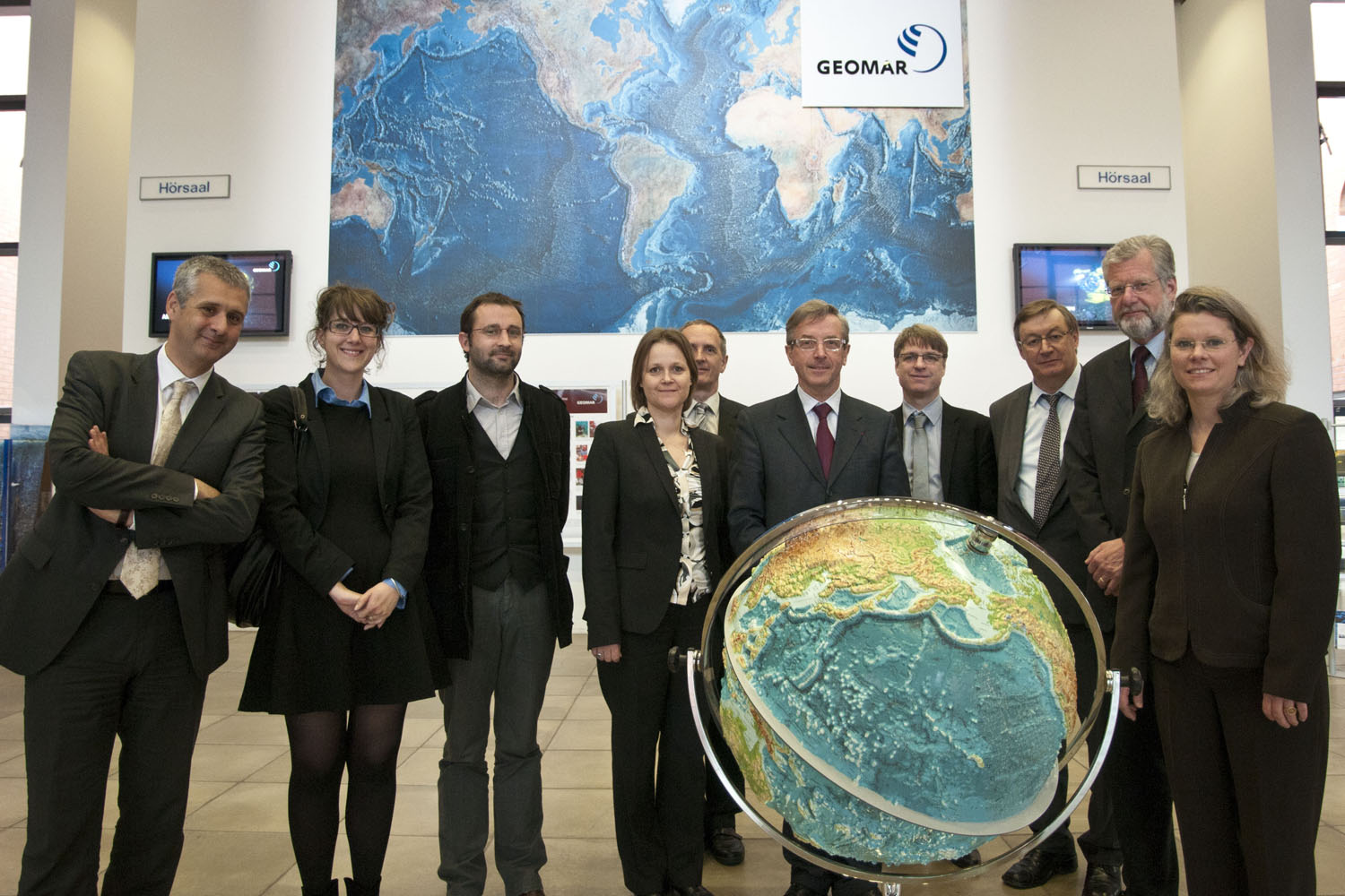25.04.2012/Kiel. Eine Delegation des französischen Meeresforschungszentrums Ifremer unter der Leitung des Präsidenten und Geschäftsführenden Direktors, Dr. Jean-Yves Perrot, stattete dem GEOMAR | Helmholtz-Zentrum für Ozeanforschung Kiel einen Kurzbesuch ab. Auf dem Programm der knapp zweitätigen Konsultationen standen unter anderem die Gashydratforschung, Fragen der Koordination der Schiffs- und Großgerätenutzung sowie die Anbahnung von neuen gemeinsamen Projekten auf europäischer Ebene. Das GEOMAR bildet mit zusammen mit dem Ifremer und dem National Oceanography Centre in Großbritannien seit einigen Jahren die sogenannte G3-Gruppe, der drei führenden Meersforschungseinrichtungen in Europa.