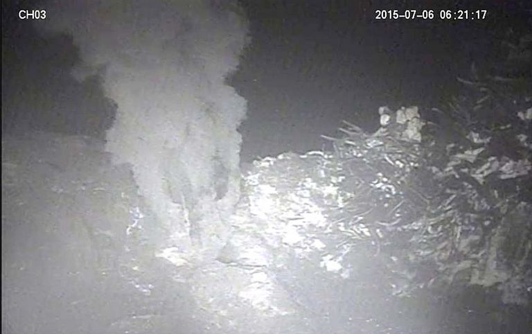 Ein Schwarzer Raucher im Guaymas-Becken, aufgenommen vom ROV HYBIS des GEOMAR. Diese heiße Quellen können CO2 und Methan mehrere hundert Meter hoch in die Wassersäule transportieren. Foto: ROV HYBIS, GEOMAR