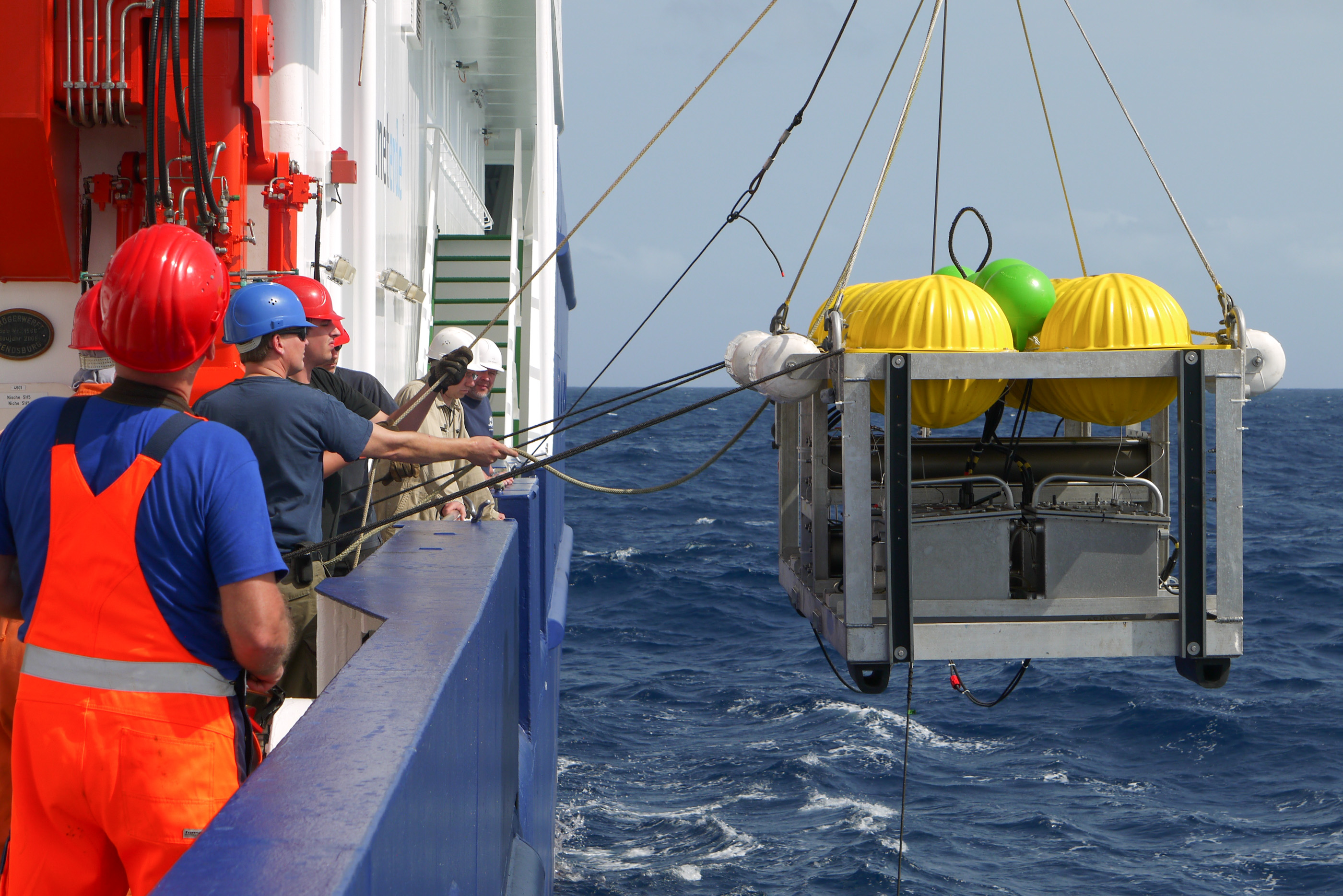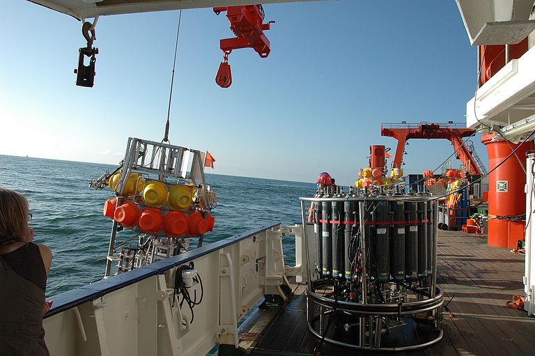 Ein autonomes Tiefseelabor (BIGO-Lander, am Kran) und ein Kranzwasserschöpfer während einer METEOR-Expediton im Januar 2013. Beide Arten von Geräten wurden während der Expeditionen des SFB intensiv genutzt, um mehr über die Sauerstoffminimumzonen in Pazifik und Atlantik zu erfahren. Foto: Michael Schneider, FS METEOR