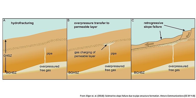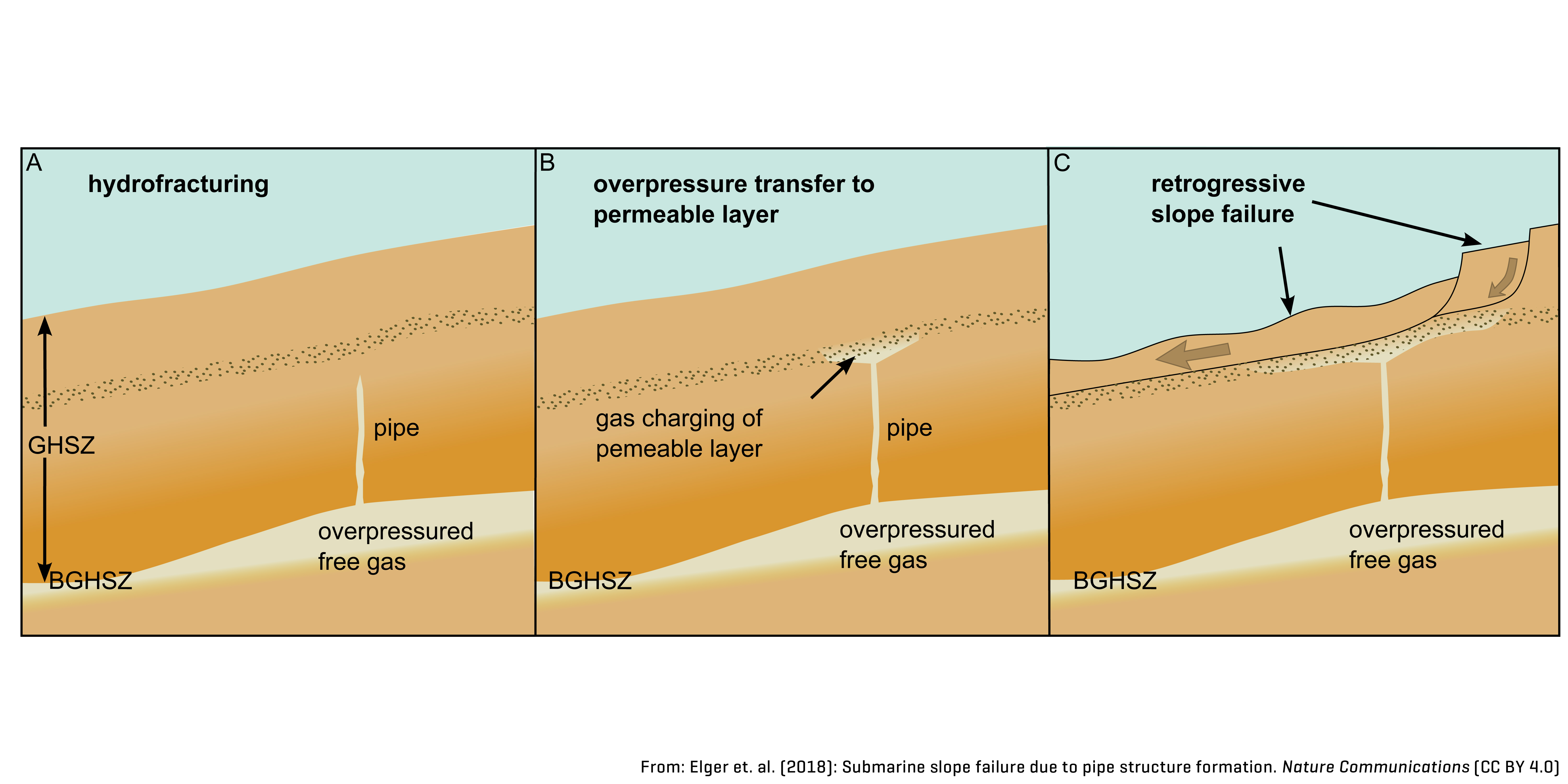 Dabei kam heraus, dass die Gashydrate eine feste, undurchlässige Schicht im Meeresboden bilden können. Darunter sammeln sich freies Gas und Flüssigkeiten. Es entsteht ein Überdruck unterhalb der Hydratschicht, bis diese nicht mehr standhält. Freies Gas und Flüssigkeiten steigen in den durch den Überdruck verursachten Rissen, die heute noch im Untergrund nachweisbar sind, schnell Richtung Meeresboden auf. Dort treffen sie auf ohnehin weniger stabiles Sediment und setzen es in Bewegung.