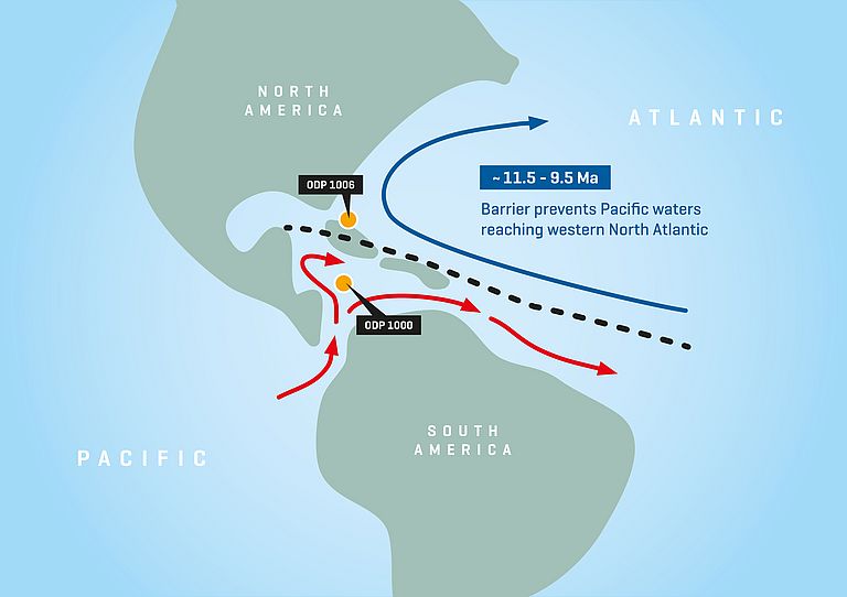 Das Team kommt zu dem Schluss, dass zwischen 9,5 und 11,5 Millionen Jahre vor heute eine Sperre zwischen zentraler Karibik und Nordatlantik existiert haben muss. Sie hielt das süßere Pazifikwasser auf. Die Oberflächenströmung der Nordatlantischen Zirkulation konnte ungeschwächt an der Karibik vorbeifließen. „Ob Windverhältnisse oder bisher unbekannte geologische Veränderungen die Sperre verursacht haben, muss noch geklärt werden“, sagt Dr. Anne Osborne.