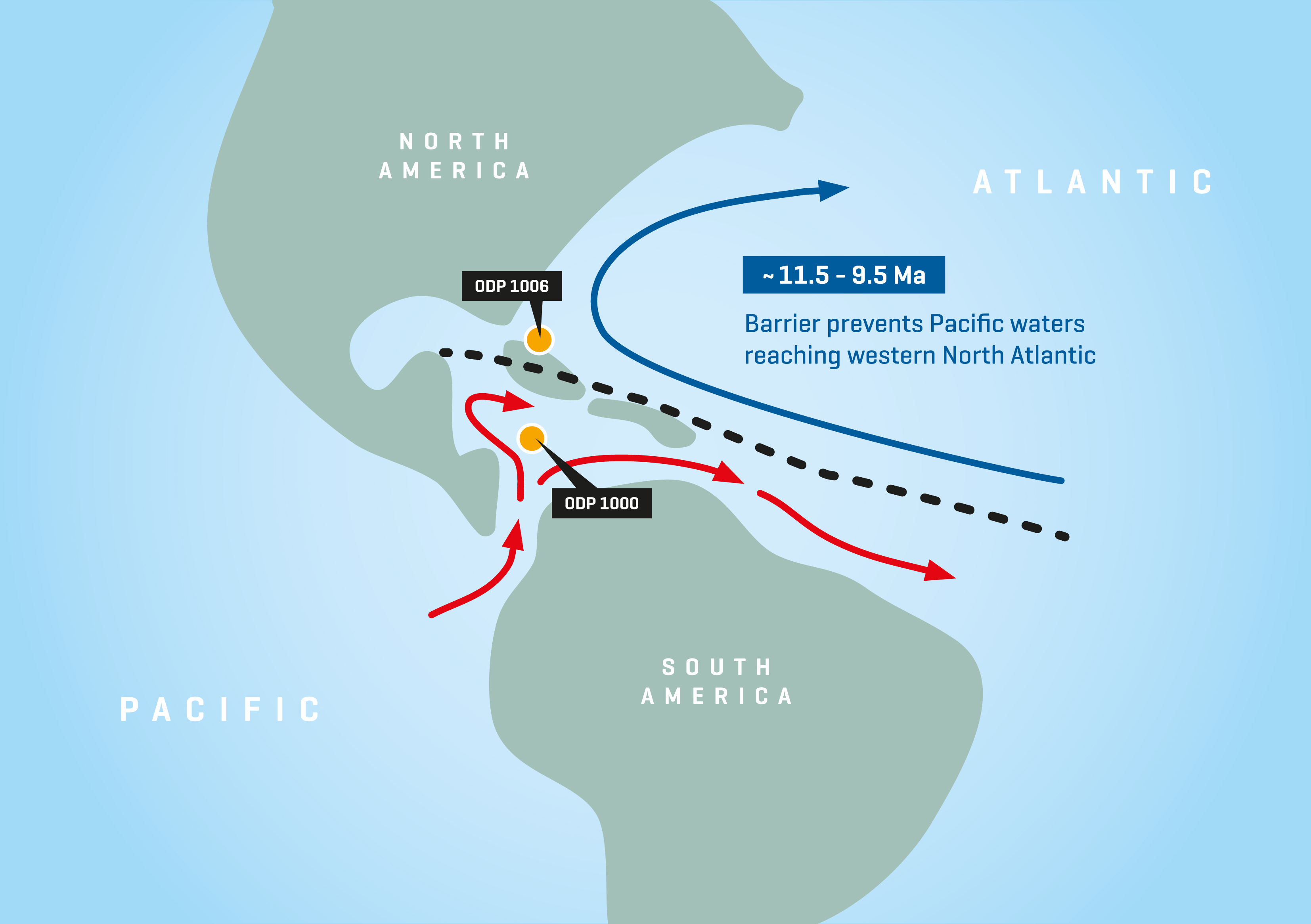 Die Randbedingungen unterschieden sich im Miozän jedoch in einem entscheidenden Punkt: Die Landverbindung zwischen Nord- und Südamerika im Gebiet des heutigen Panama war noch nicht geschlossen. Salzarmes Wasser aus dem Pazifik konnte Richtung Atlantik fließen.