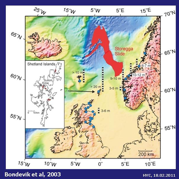 Eine extrem große Rutschung an einem Kontinentalrand ereignete sich vor ca. 8.000 Jahren vor Norwegen. Sie ist unter dem Namen Storegga Rutschung bekannt. Ein Gebiet von der Größe Islands rutschte bis zu 800 Meter den Hang hinunter. Funde an Land belegen, dass diese Rutschung eine 10 bis 20 Meter hohe Tsunami-Welle ausgelöst hat. Betroffen waren vor allem die norwegisch Küste, aber auch die britische Küste und die Shetland-Inseln. Die Rutschung wurde in den vergangenen Jahren extrem gut untersucht, da sich unmittelbar unterhalb der Abrisskante in 800 bis 1.100 Meter Wassertiefe eine sehr große Erdgaslagerstätte befindet. Anders als bei anderen Lagerstätten wurde keinen Plattformen errichtet, sondern Fördermöglichkeiten direkt auf dem Meeresboden gebaut. Das Erdgas wird von dort durch Pipelines direkt nach England und Norwegen transportiert. Im Vorfeld wurden detaillierte geotechnische Untersuchungen durchgeführt, die belegen, dass der jetzige Hang stabil ist, da die instabilen Sedimente durch die Storegga Rutschung bereits hangabwärts transportiert worden sind. Für die Konstruktionen am Meeresboden besteht daher aller Vorraussicht nach keine Gefahr.