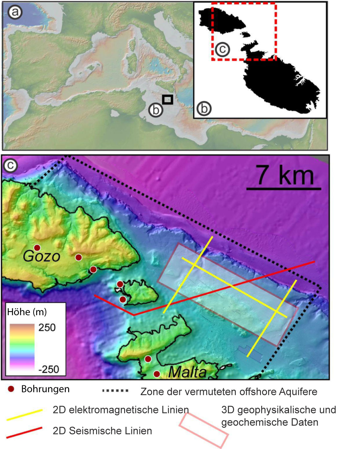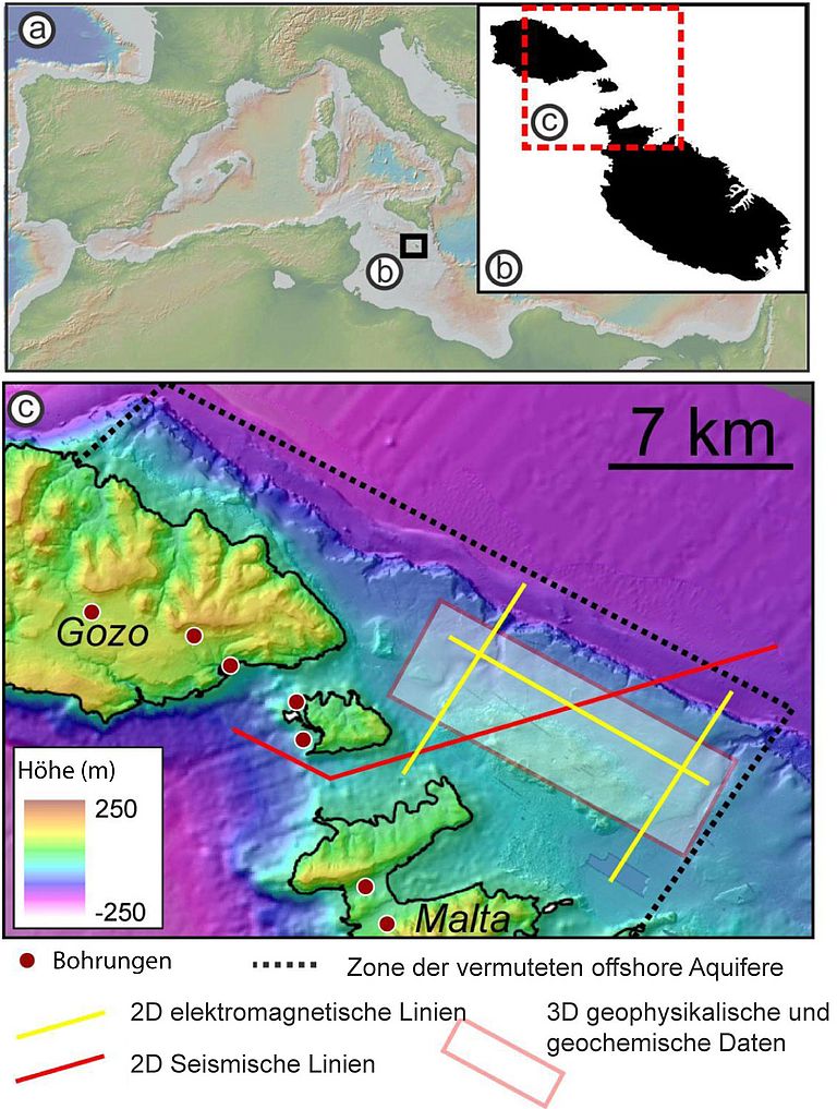 Die Grundwasservorräte auf den maltesischen Inseln, aber auch im gesamten Mittelmeer sind durch den Bevölkerungswachstum, die zunehmende Umweltverschmutzung und den Klimawandel enormen Belastungen ausgesetzt. Sogenannte Offshore-Aquifere (OA), Süßwasserkörper unterhalb des Meeresbodens, stellen eine alternative Süßwasserquelle dar, die die Wasserknappheit in Küstenregionen verringern könnte. Es gibt jedoch eine Reihe von Problemen, die gelöst werden müssen, bevor OAs nachhaltig genutzt werden können. Dazu gehören bisher fehlende Kenntnisse über Standorte, die Ausdehnung und die Entwicklung von OAs sowie deren Verbindung mit Aquiferen an Land.