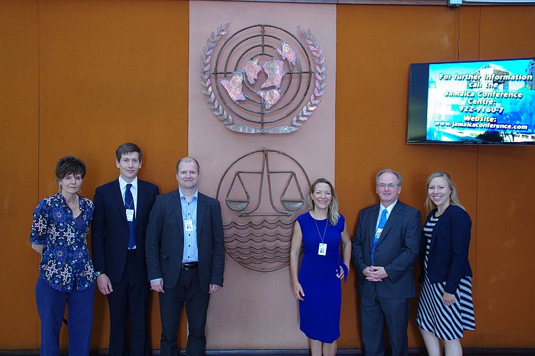 Die Wissenschaftlerinnen und Wissenschaftler des europäischen Projekts JPIO MiningImpact bei der Internationalen Meeresbodenbehörde ISA: (vl.n.r.) Prof. Dr. Ann Vanreusel (Univ. Gent, Belgien), Dr. Daniel Jones (NOC Southampton, UK), Dr. Matthias Haeckel (GEOMAR), Prof. Dr. Antje Boetius (AWI, MPI Bremen), Dr. David Billett (ISA), Kristin Hamann (GEOMAR). Foto: John Hanus, JPIOceans