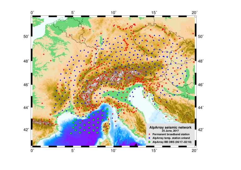 Europas größte ‚Knautschzone’, die Alpen, liegt an der Grenze zweier großer Erdplatten: Europa und Afrika. Doch zwischen diesen beiden Platten sind eine ganze Anzahl kleinerer Mikroplatten im alpinen Raum gefangen. Die Bildung der Alpen findet also in einer tektonisch komplexen Region statt, die weit über die eigentliche Gebirgskette hinausreicht. Die tief im Erdinneren ablaufenden Vorgänge zu verstehen, erfordert einen multinationalen und multidisziplinären Ansatz. Im Rahmen des Projektes AlpArray haben sich 50 Institute aus 18 europäischen Nationen zusammengeschlossen, um den Alpenraum mit einem engmaschigen Netz von Erdbeben-Seismometer zu überdecken und so die Signale aus der Tiefe in hoher Auflösung zu registrieren.