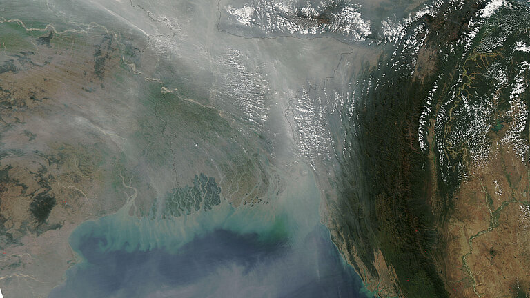 Blassgrauer Dunst zieht südlich des Himalaya entlang der Ostgrenze Bangladeschs zum Golf von Bengalen. Neben landwirtschaftlichen Bränden tragen vor allem die städtische und industrielle Verschmutzung in der Region zu der Dunstwolke bei. Welchen Einfluss die so genannte Braune Wolke auf die Biogeochemie des Wassers hat, wird im Rahmen der BIOCAT-Expedition untersucht. Foto: NASA