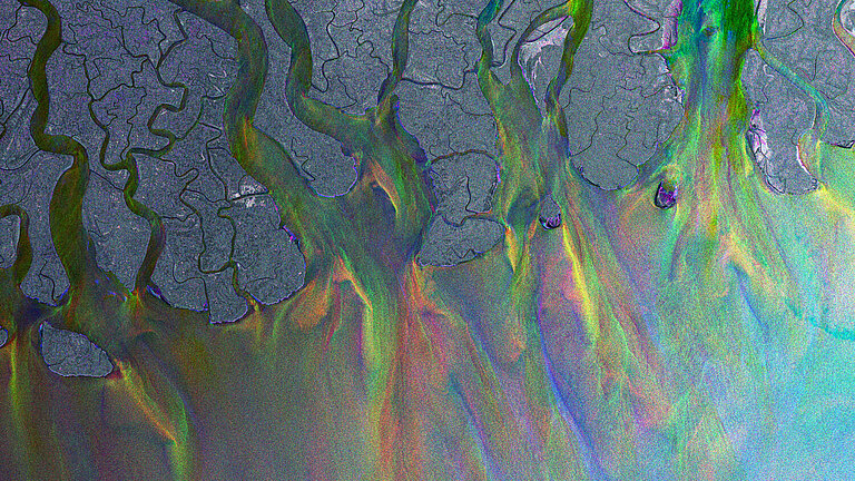 Das Ganges-Delta ist das größte Flussdelta der Welt: Auf rund 350 Kilometern Breite münden die Flüsse Ganges und Brahmaputra, aufgefächert in eine Vielzahl von Wasserläufen in den Golf von Bengalen, was einen riesigen Frischwassereintrag bedeutet. Foto: ESA