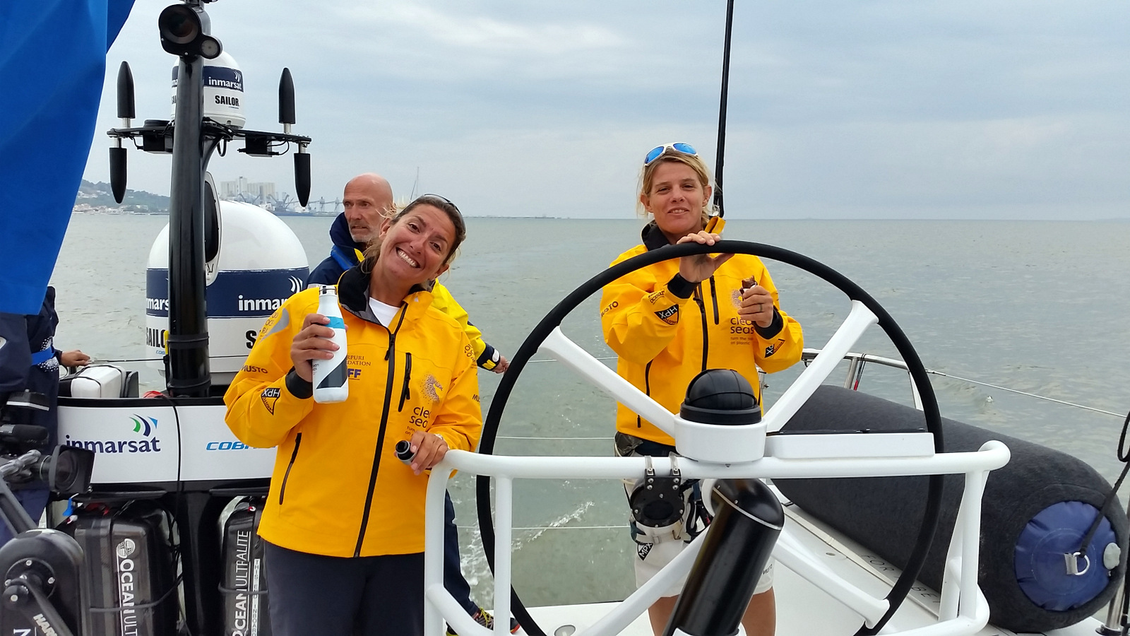 Die Skipperin der "Turn the Tide on Plastic, Dee Caffari (li.). Boat Captain Liz Wardley (re.) kümmert sich während der Rennen auch um die installierte Sensorik. Foto: Sören Gutekunst, GEOMAR