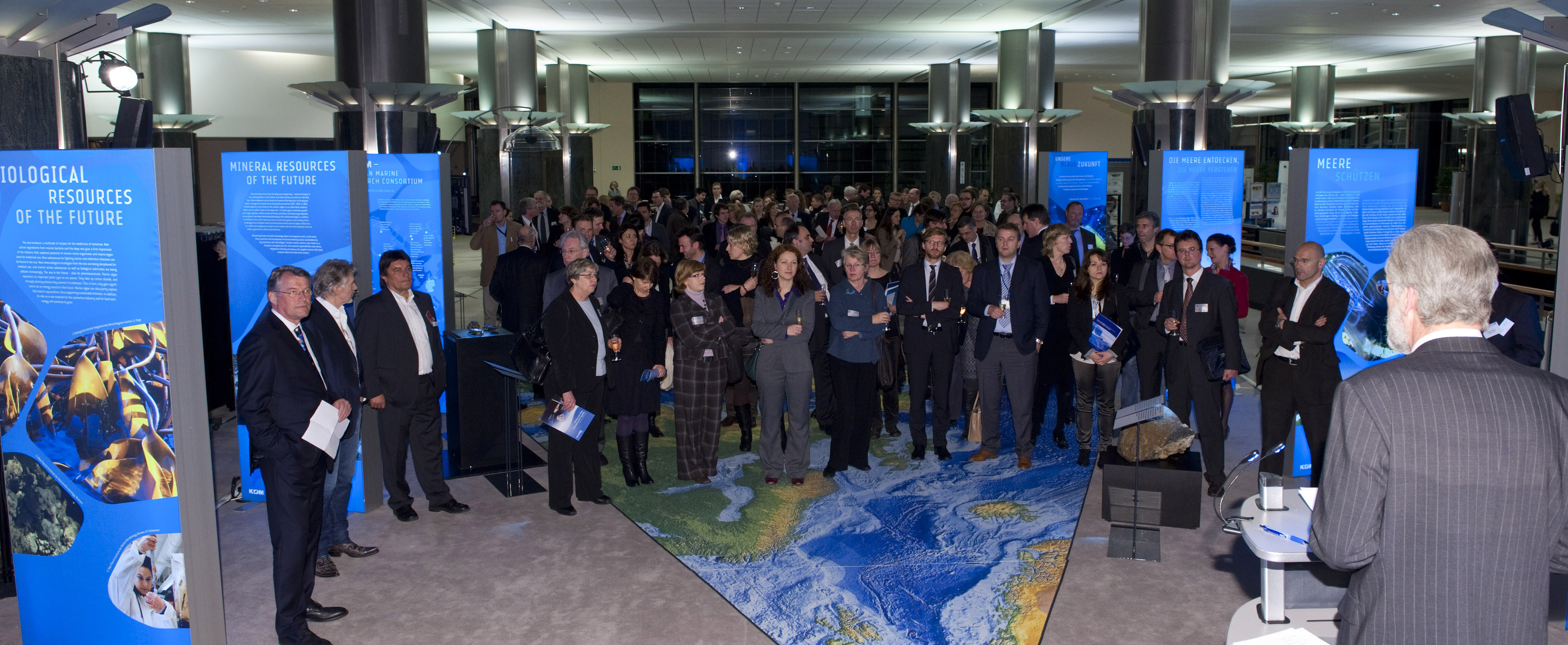 Am Abend lädt KDM zu einem Empfang mit Gastredner und Erfolgsautor Frank Schätzing in die Ausstellung „Unsere Blaue Zukunft“ im Europäischen Parlament ein. Die Ausstellung präsentiert den Beitrag der Meeresforschung zur Gestaltung des künftigen Umgangs der Menschen mit dem Meer: Mit entsprechender Forschung könnten Wissenschaftler Wirkstoffe aus dem Meer gewinnen, die bei der Bekämpfung von Krebs oder Infektionskrankheiten helfen. Auch für die Industrie wichtige Rohstoffe wie Kupfer und Zink, Silber und Gold, Indium, Gallium oder Germanium sind am Meeresboden zu finden. Wissenschaftler zeigen auf, wie sich diese Elemente, aber auch marine Öl- und Gasvorkommen nachhaltig nutzen lassen bzw. welche Problematiken mit diesen Tätigkeitsfeldern verknüpft sind. Auch die Fischereipolitik profitiert vom Wissen der Forscher, die Grundlagen für einen umweltverträglicheren und zugleich ertragreicheren Fischfang formuliert haben. Weil Stürme und Fluten infolge des Klimawandels Küstengebiete bedrohen, gilt es, auf der Basis von wissenschaftlichen Analysen effektive und sinnvolle Sicherheitsmaßnamen zu ergreifen.